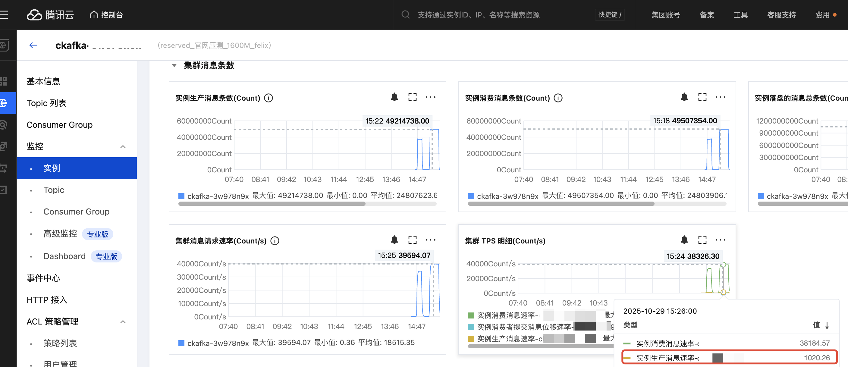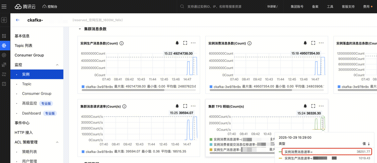 压测规格 | 压缩配置 | 实际生产带宽(MB/s) | 实际消费带宽(MB/s) | 生产时延-平均(毫秒) | 生产时延-P95(毫秒) | 生产时延-P99(毫秒) | 消费时延-平均(毫秒) | 消费时延-P95(毫秒) | 消费时延-P99(毫秒) | 生产QPS | 消费QPS | 集群负载指标 |