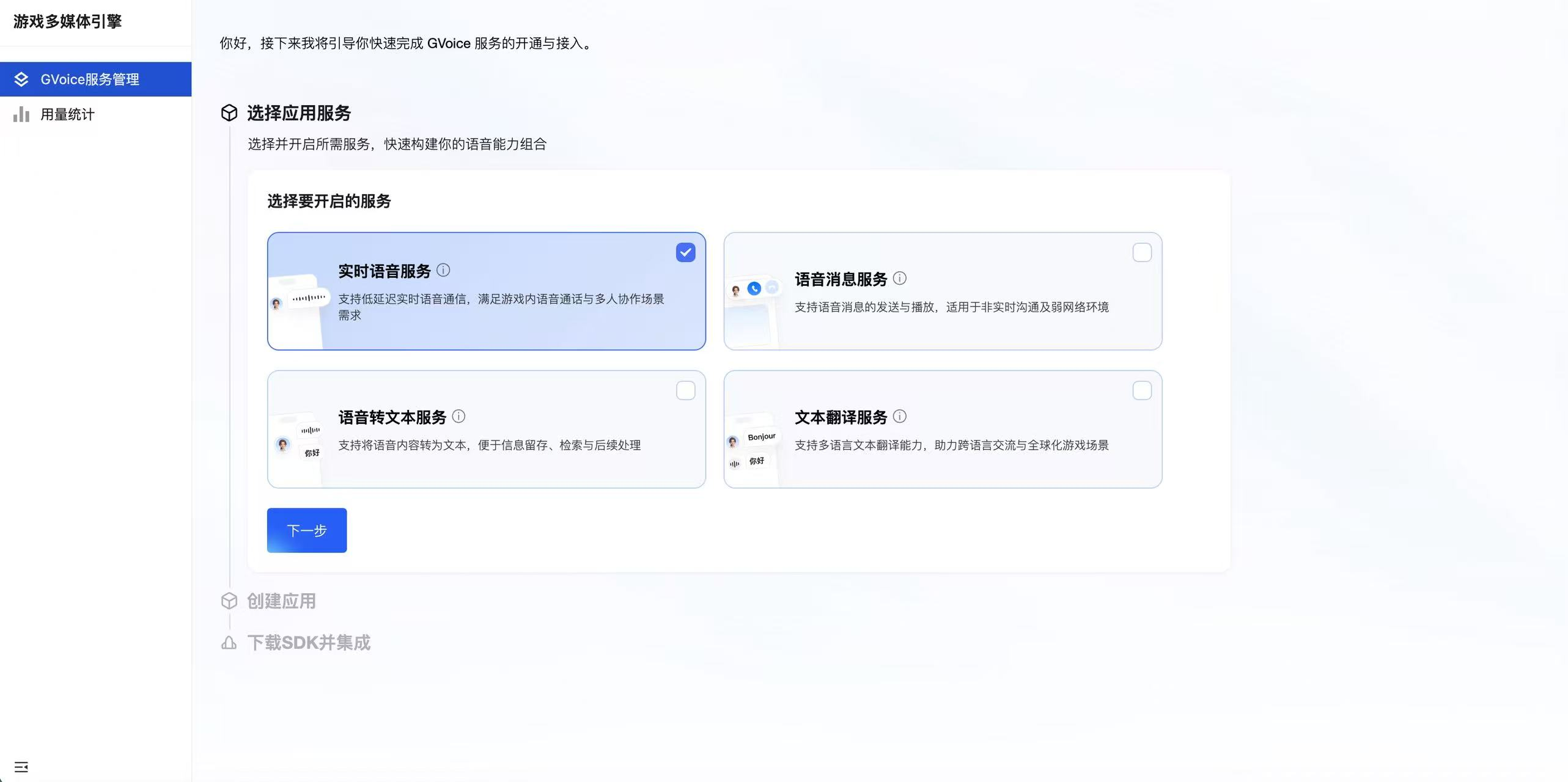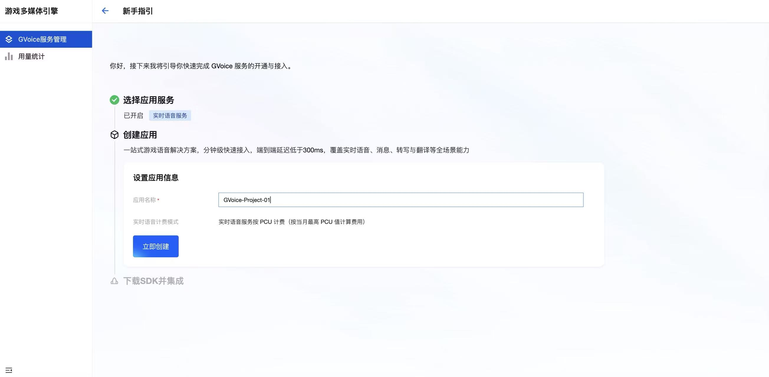 针对首次使用 GVoice 服务的用户,引导用户逐步开启服务并创建应用,操作步骤: