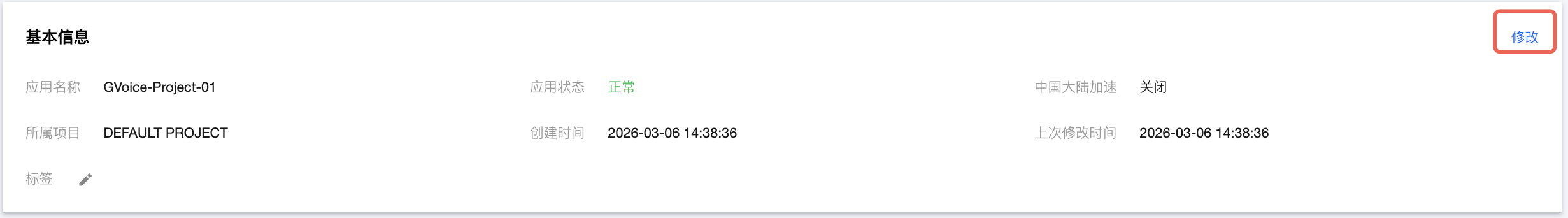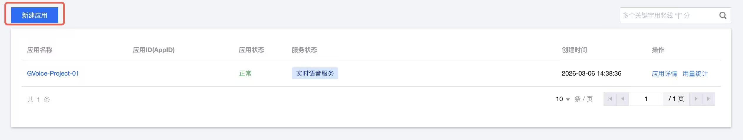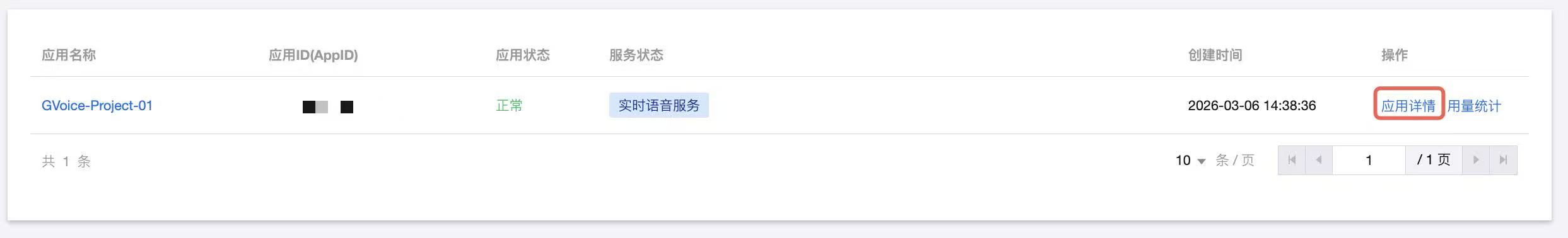 新建应用后,应用将在 GVoice 服务管理页面的应用列表中展示,单击应用详情可进入应用详情页,查看和管理当前应用信息。
