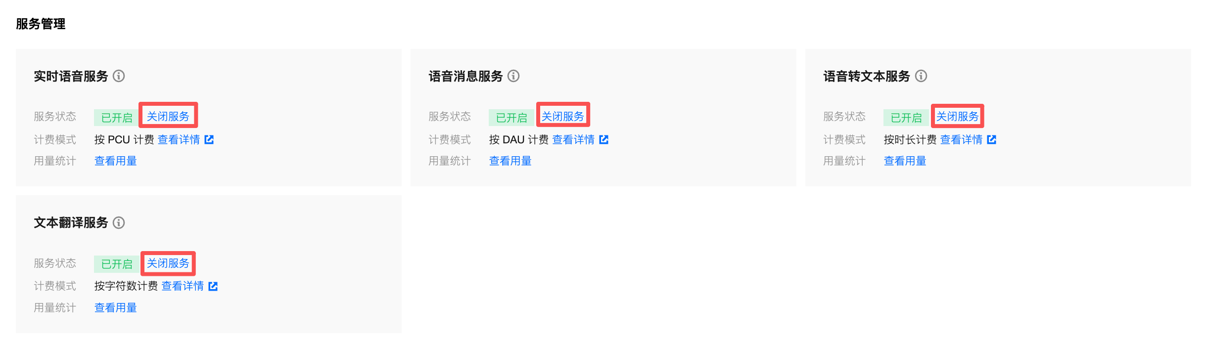 2. 单击对应服务的查看用量,可查看当前应用下该服务的具体使用量,详见用量查看。 停用 GVoice 应用服务