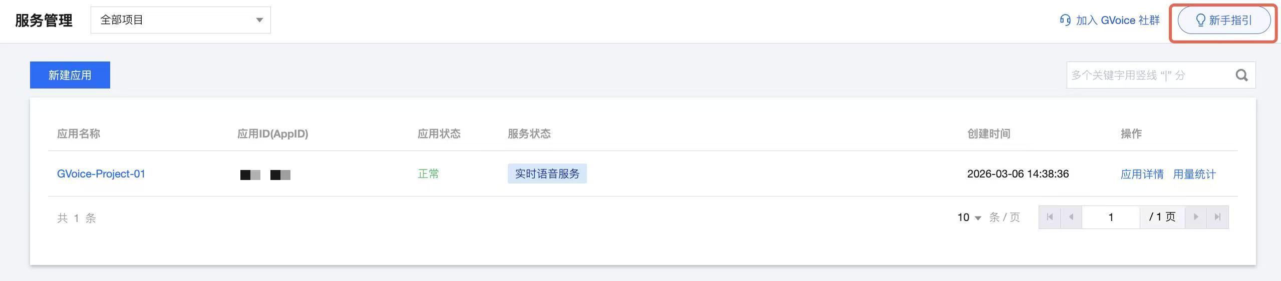 完成新手指引流程后,后续在 GVoice 服务管理页面可点击新手指引再次进入。