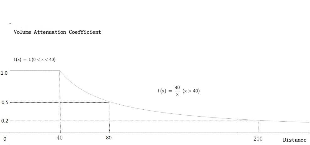 3D 音效中,音源音量的大小与音源距离有一定的衰减关系。单位距离超过 range 之后,音量衰减到几乎为零。