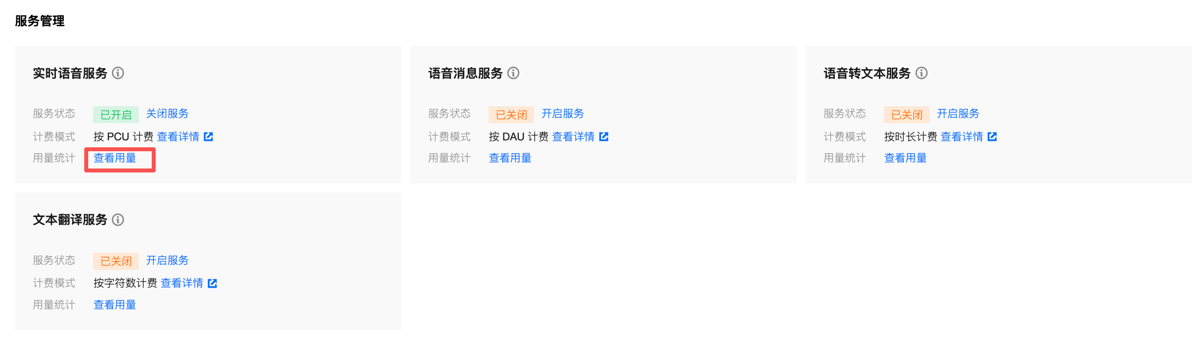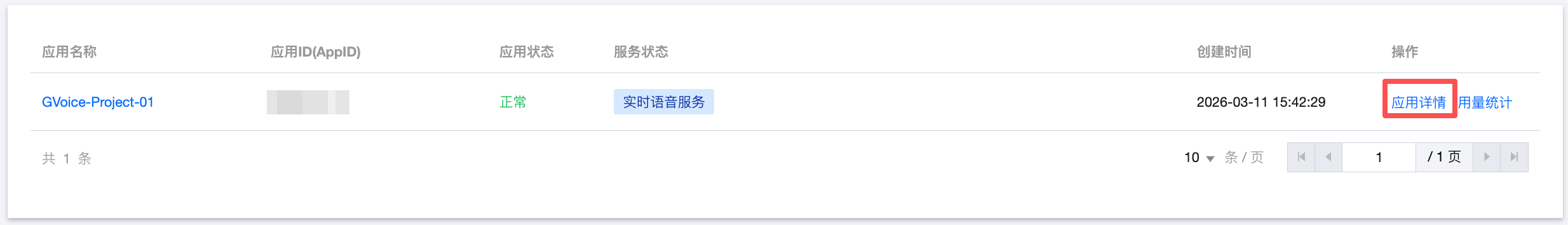 应用详情页面:在 GVoice 服务管理页面的应用列表中单击应用详情,在服务管理区块中单击对应服务的查看用量,即可查看该应用下该服务的具体使用量。