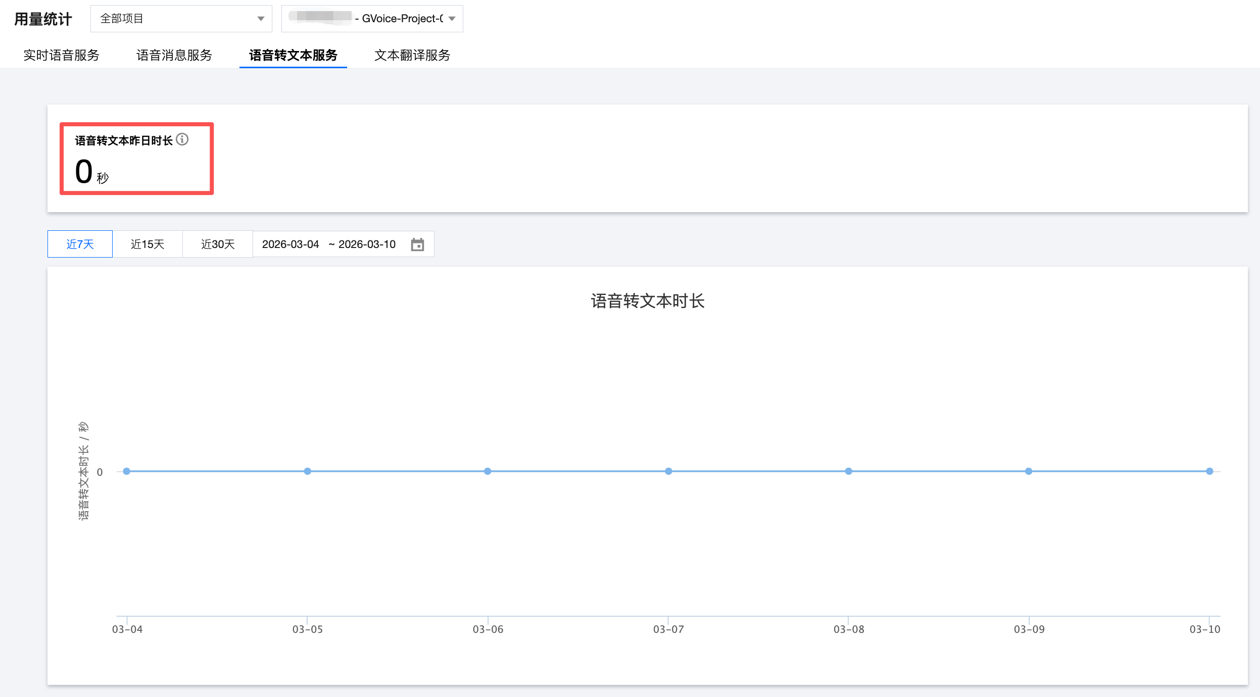 折线图默认展示近 7 天的语音转文本时长用量数据,支持切换时间范围查看对应的用量情况。