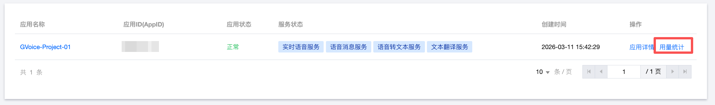 GVoice 服务管理页面:在应用列表中单击用量统计,可查看对应应用的用量。