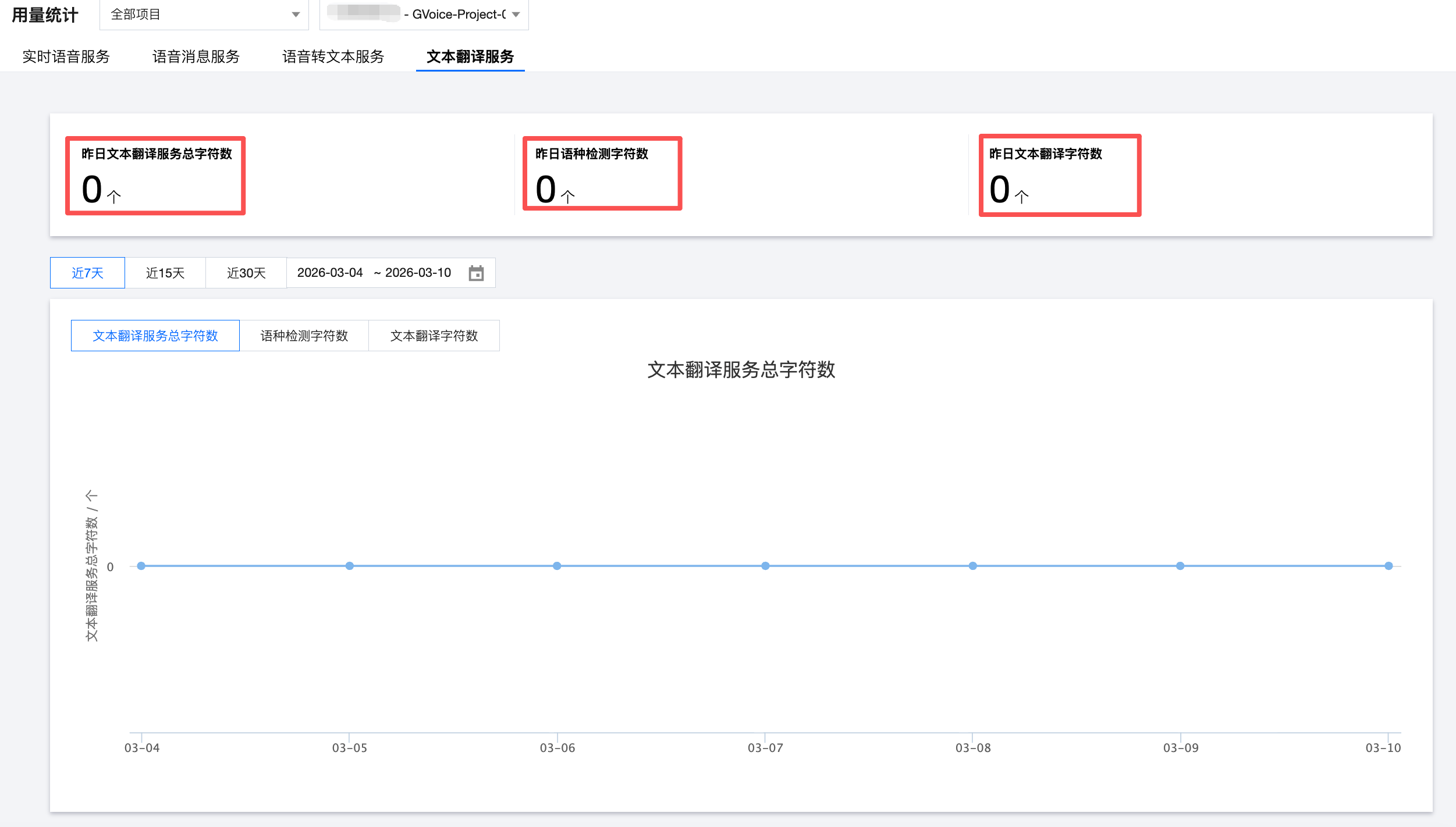 折线图默认展示近 7 天的字符数用量数据,并支持切换时间范围及不同翻译类型查看对应的用量情况。
