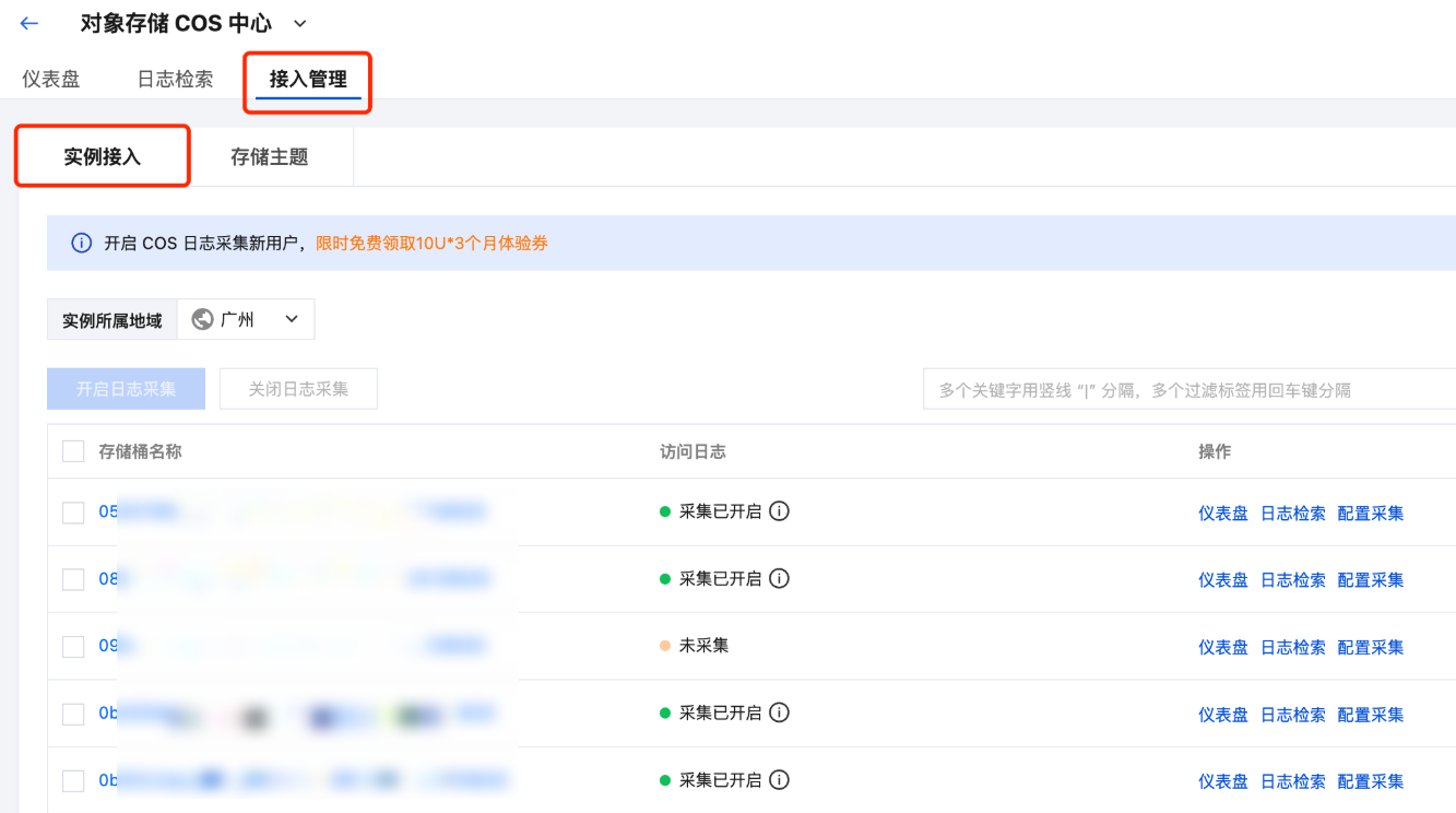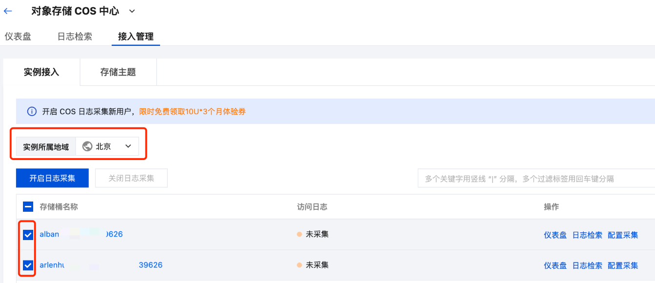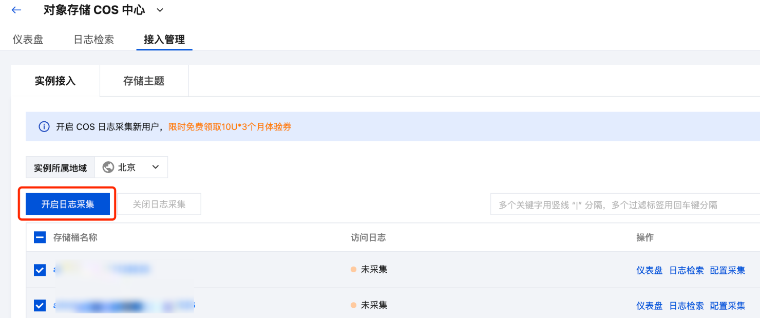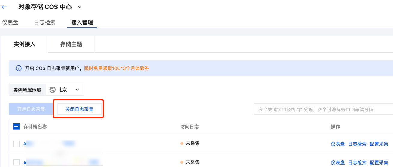 2. 在存储桶列表中选中需要关闭日志采集的存储桶,并单击关闭日志采集。