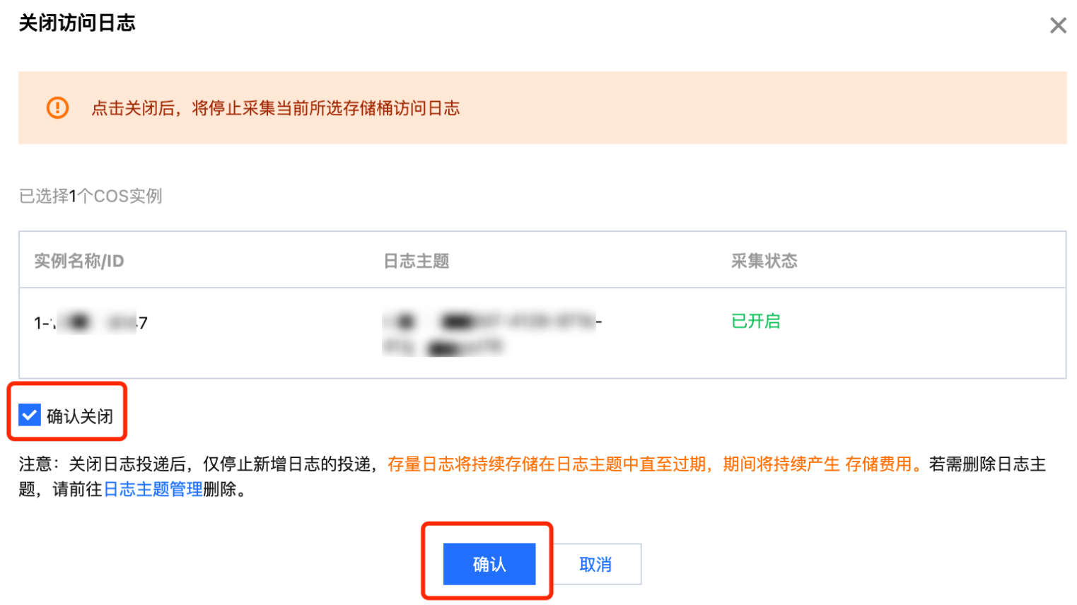 关闭日志采集仅代表不再采集新增日志,存量已采集日志将持续存储与日志主题中直至过期,期间将持续产生 存储费用。若不希望持续存储,请选择接入管理 > 存储主题,在其中找到目标主题并删除。 3. 在关闭采集弹窗中,需再次确认关闭,然后单击确认即可关闭选中存储桶的日志采集。