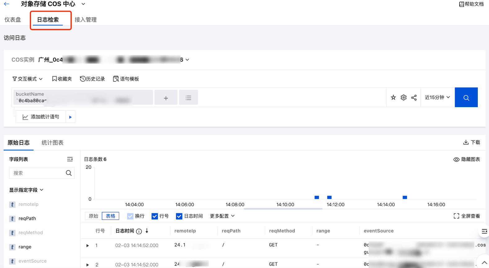 1. 完成开启存储桶访问日志采集后,在顶部 Tab 栏中,选择日志检索。