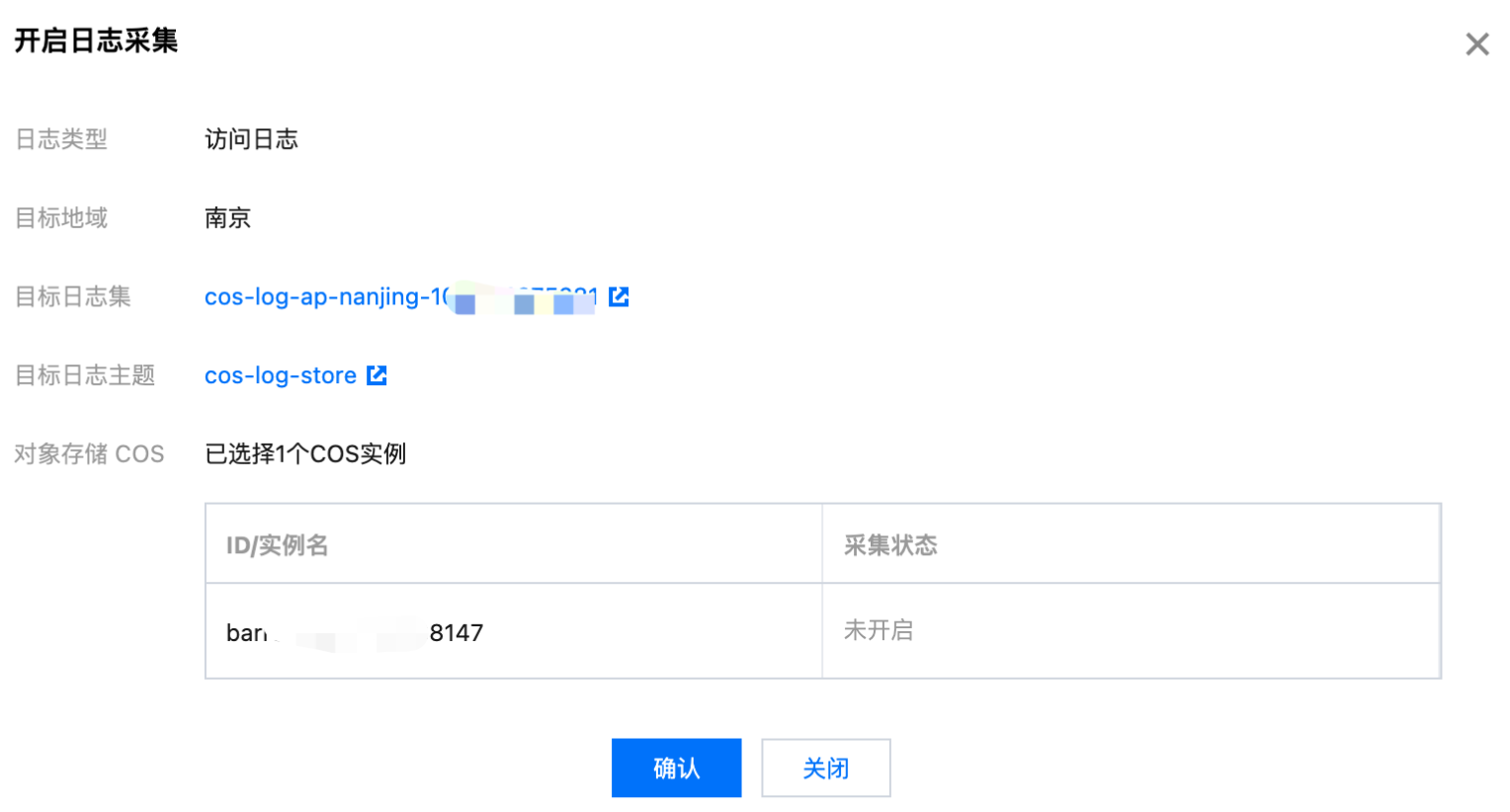 4. 在开启日志采集弹窗中,单击确认,即可开启目标存储桶实例的访问日志采集。