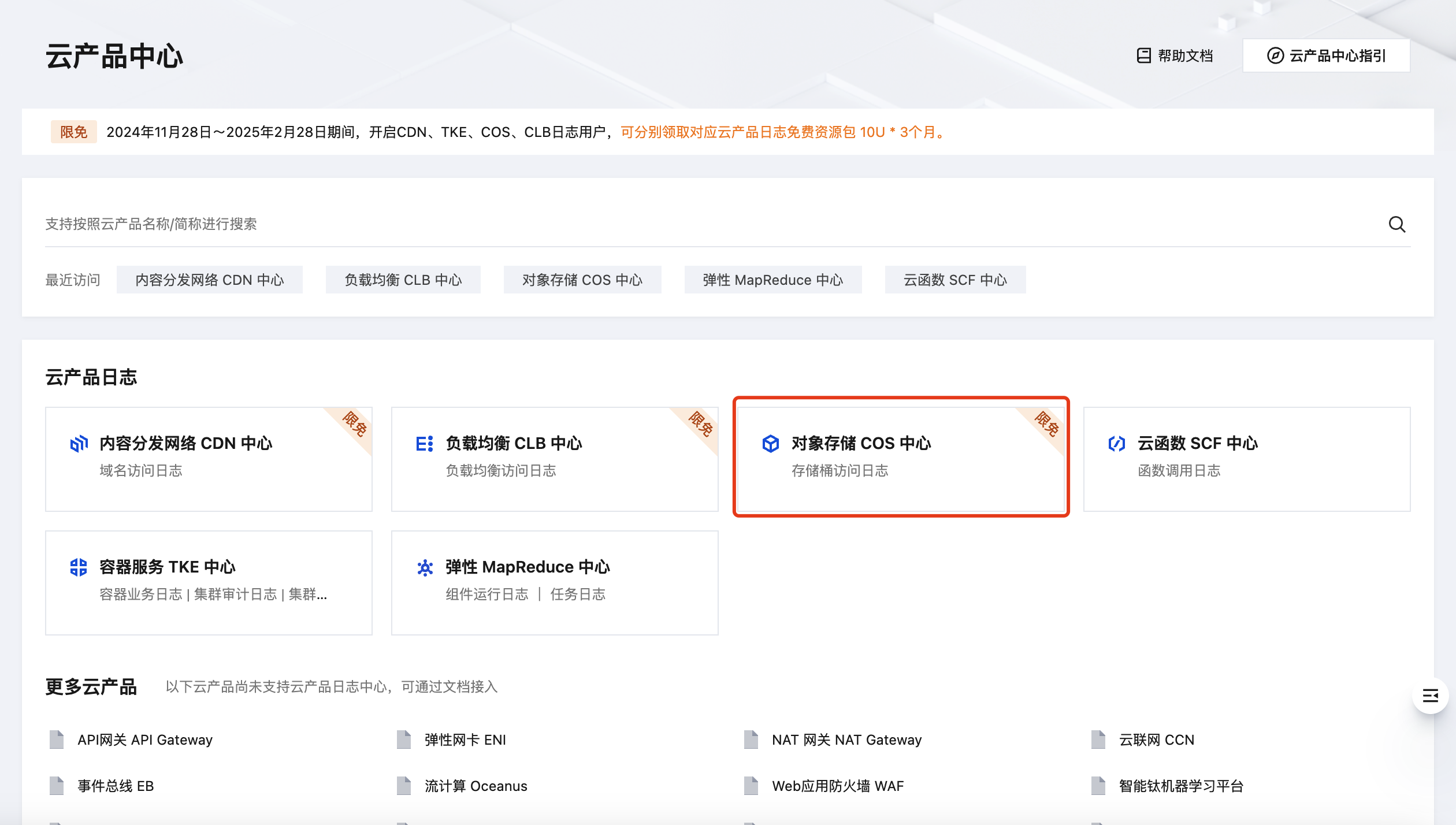 3. 在云产品日志中,选择并单击对象存储 COS 中心。