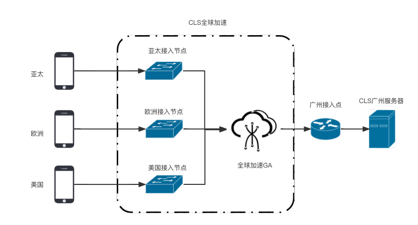 腾讯云 CLS 全球加速解决方案用于解决在网络环境比较差的情况下,用户能稳定上传日志的问题,该方案能够加速通过任何网络环境上传日志到 CLS,对于跨国公司和移动互联网企业来说,此解决方案能够为网站、移动应用和应用服务提供安全可靠的方式快速连接,实现网络服务全球范围就近接入和跨地域部署。