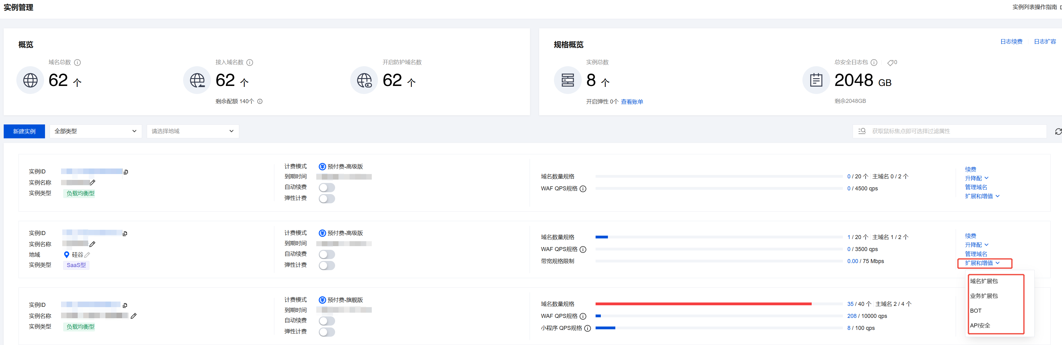 2. 在实例管理页面,选择目标实例并单击扩展和增值。相关配置的详细信息,请参见 增值配置表 和 扩展配置表。 3. 单击需要进行扩展或增值的配置,进入购买页面进行配置。