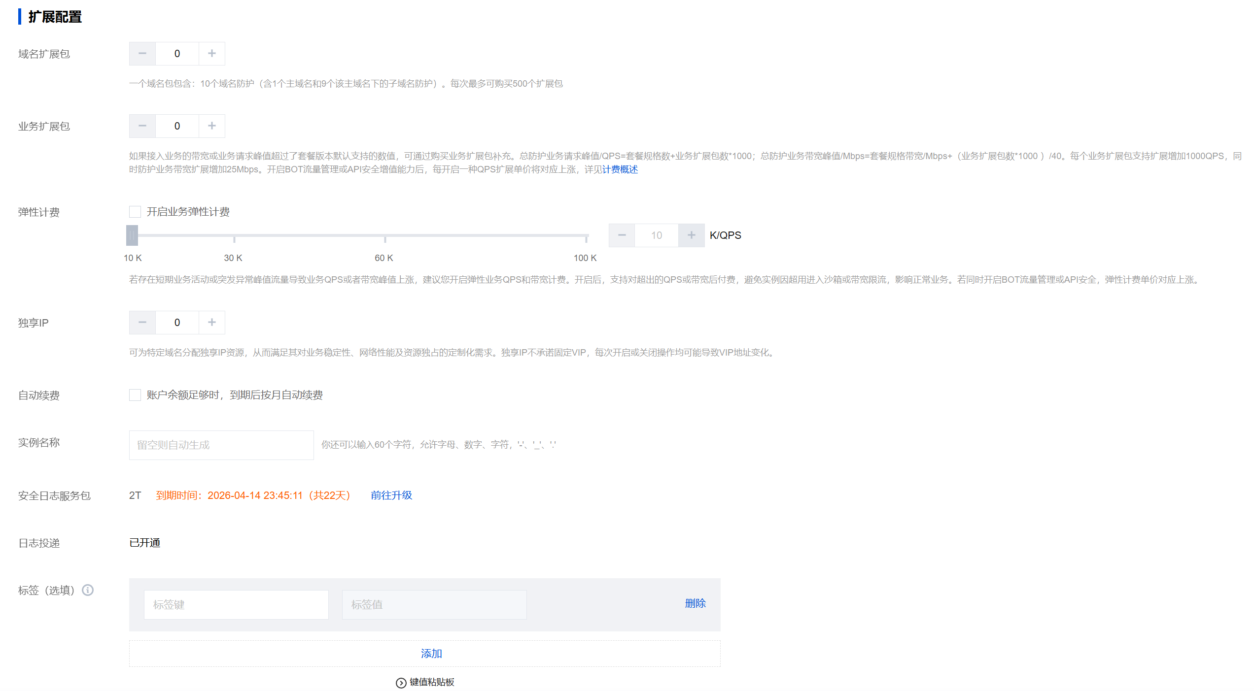 不同套餐规格所支持的增值配置存在差异,具体支持情况请以 购买 页面的展示信息为准。 3. 根据实际需求,选择 WAF 的扩展配置: