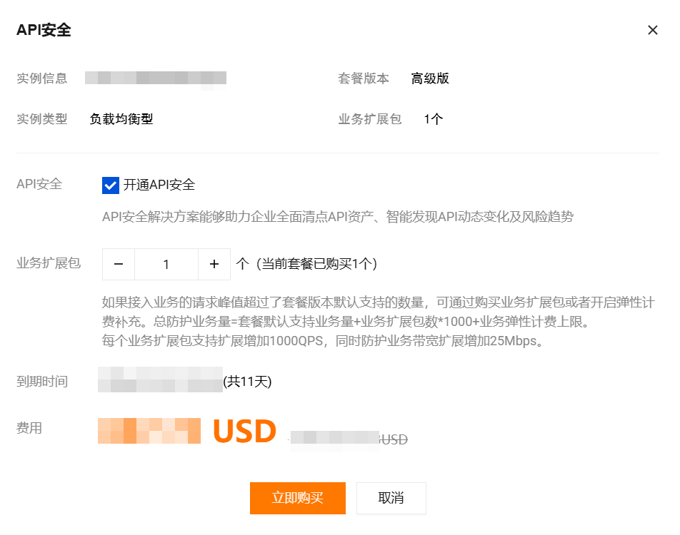 以 API 安全为例,若您未在购买 WAF 实例时选择 API 安全,可按需购买此增值配置,BOT 流量管理等增值配置购买方式同理: