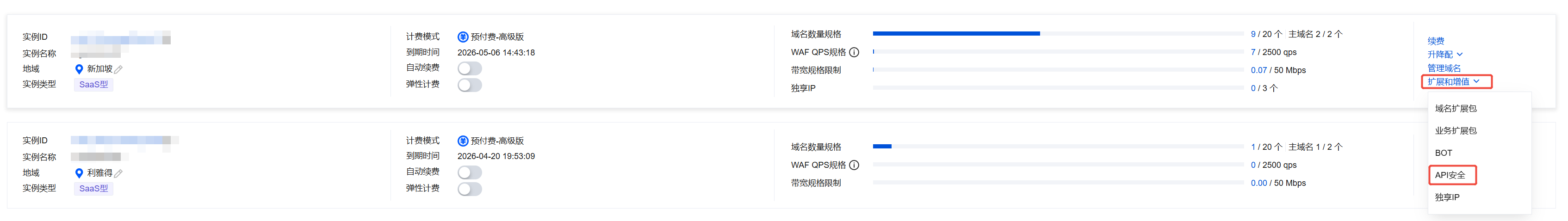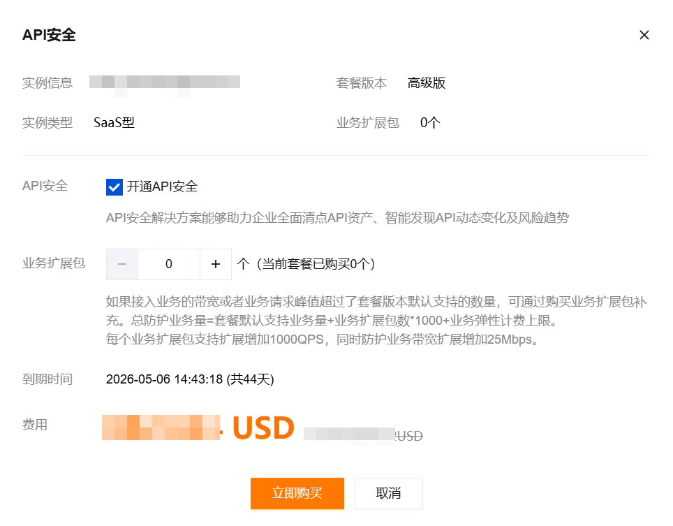 1. 在 实例管理页面,选择所需实例,单击扩展和增值 > API 安全。 2. 在 API 安全弹窗中,勾选所需服务,和业务扩展包数量,单击立即购买。