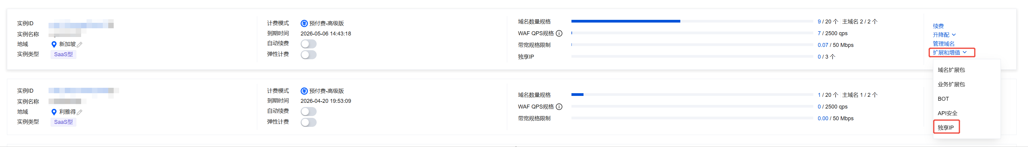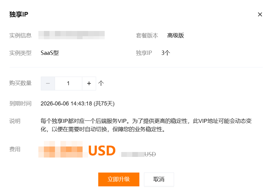 仅 SaaS 型 WAF 支持独享 IP。如需启用,请 提交工单 或联系专属客户经理申请购买。 1. 在 实例管理页面,选择所需实例,单击扩展和增值 > 独享 IP。 2. 在独享 IP 弹窗中,选择购买数量,单击立即升级。