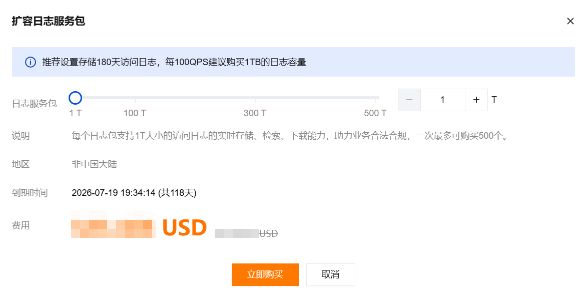 2. 在升级日志服务包弹窗中,选择购买数量,单击立即购买。