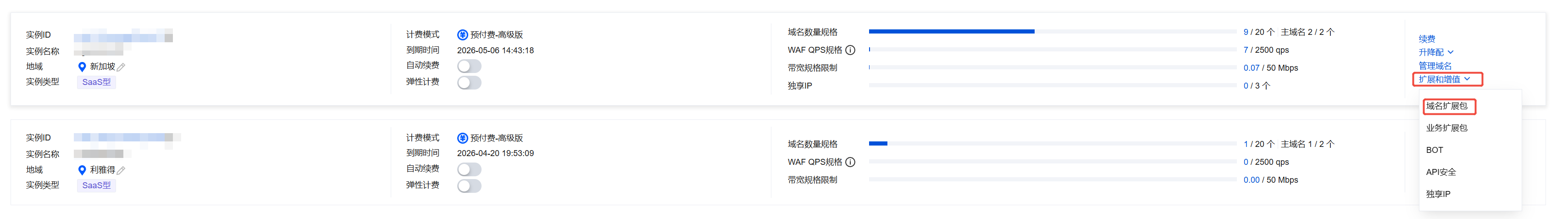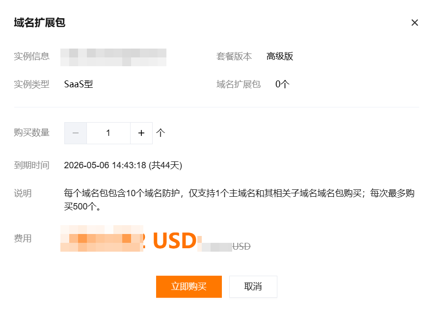 1. 在 实例管理页面,选择所需实例,单击扩展和增值 > 域名扩展包。 2. 在扩展域名包弹窗中,选择购买数量,单击立即购买。