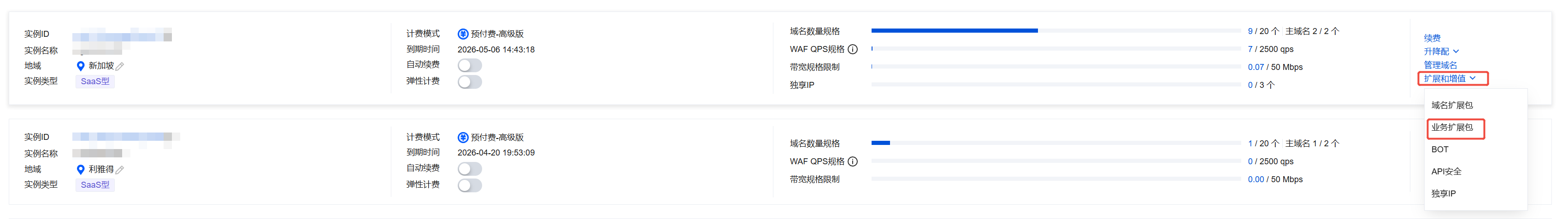 1. 在 实例管理页面,选择所需实例,单击扩展和增值 > 业务扩展包。