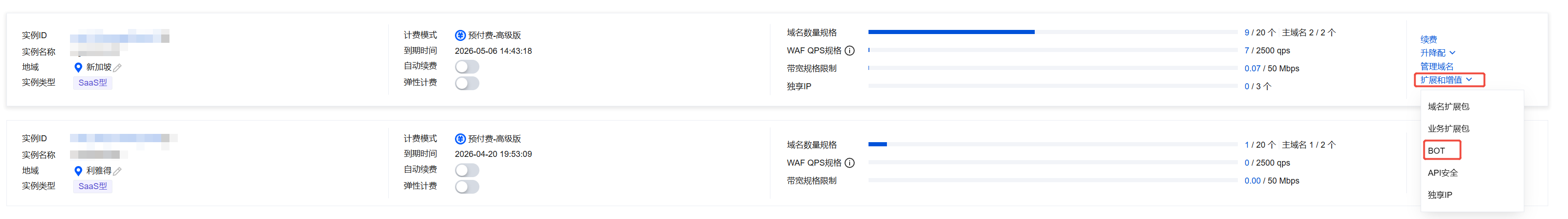 1. 在 实例管理页面,选择所需实例,单击扩展和增值 > BOT。