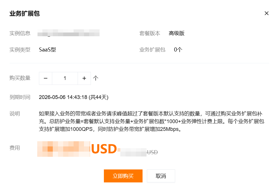 2. 在 业务扩展包弹窗中,选择购买数量,单击立即购买。