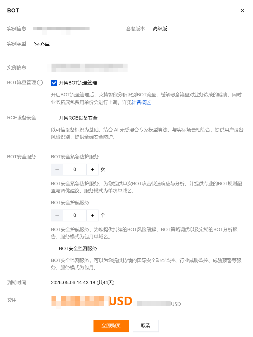 2. 在 BOT 扩展弹窗中,勾选所需服务,单击立即购买。