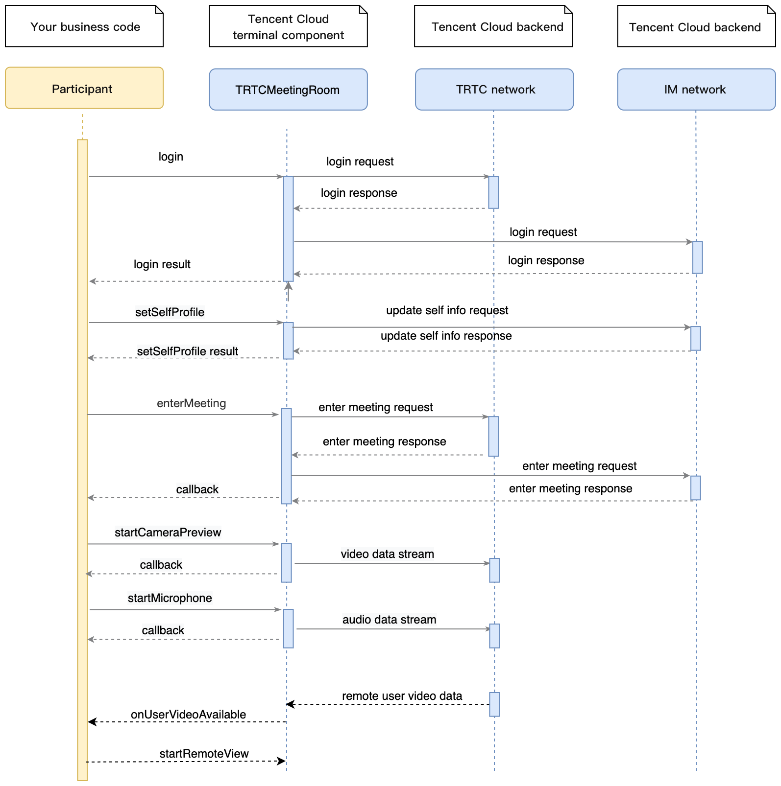 // 1. 参会成员设置昵称和头像trtcMeeting.setSelfProfile('my_name', 'my_avatar');// 2. 参会成员调用 enterMeeting 进入会议房间ActionCallback res = await trtcMeeting.enterMeeting(roomId);if (res.code == 0) {// 进入会议成功// 3. 打开摄像头和音频采集trtcMeeting.startCameraPreview(true, TRTCCloudVideoViewId);trtcMeeting.startMicrophone();// 4. 设置美颜trtcMeeting.getBeautyManager().setBeautyStyle(TRTCCloudDef.TRTC_BEAUTY_STYLE_PITU);trtcMeeting.getBeautyManager().setBeautyLevel(6);}// 5. 参会成员收到其他成员摄像头打开的通知,开始播放trtcMeeting.registerListener(onListener);onListener(TRTCMeetingDelegate type, param) {switch (type) {case TRTCMeetingDelegate.onUserVideoAvailable:if (param['available']) {trtcMeeting.startCameraPreview(param['userId'],TRTCCloudDef.TRTC_VIDEO_STREAM_TYPE_BIG,TRTCCloudVideoViewId);} else {trtcMeeting.stopRemoteView(param['userId'],TRTCCloudDef.TRTC_VIDEO_STREAM_TYPE_BIG);}break;}}