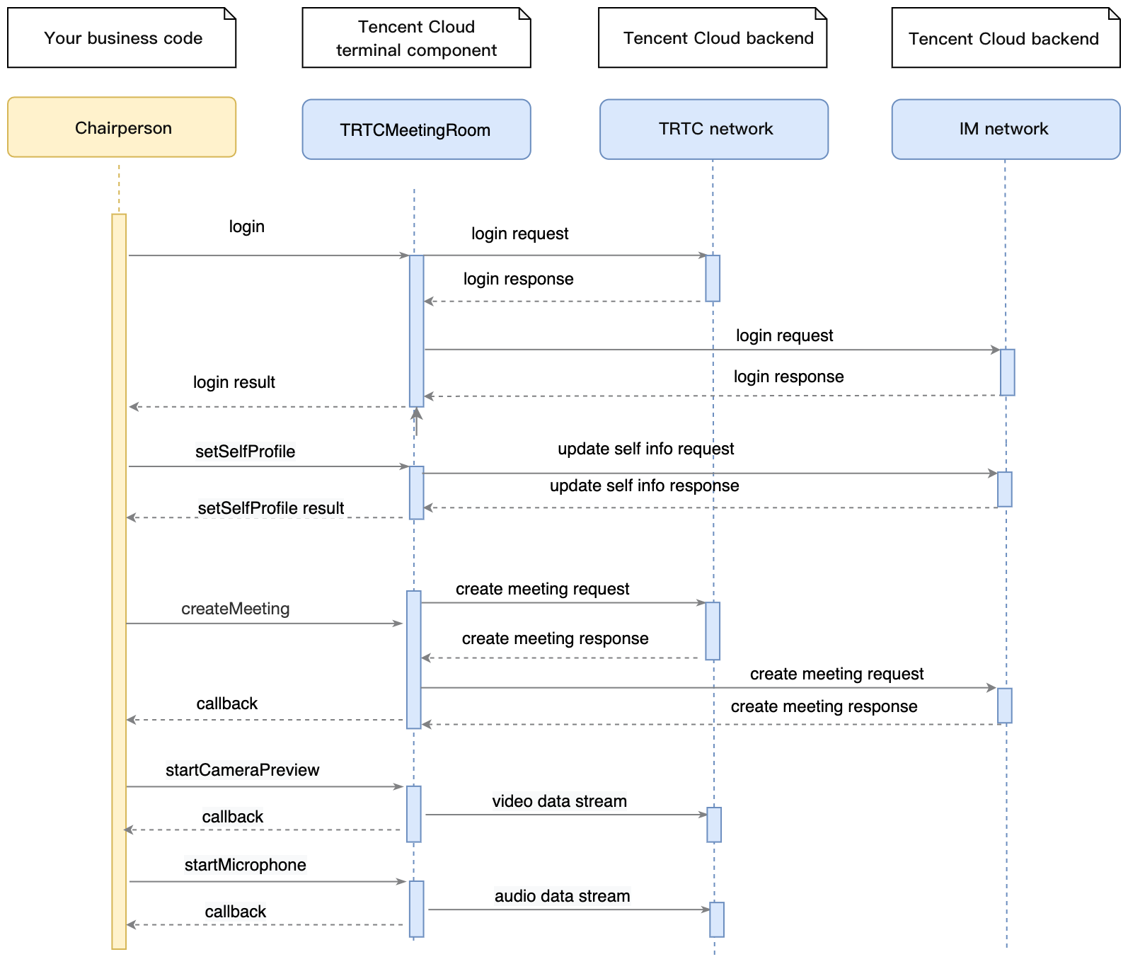 // 1. 主持人设置昵称和头像trtcMeeting.setSelfProfile('my_name', 'my_avatar');// 2. 主持人创建会议ActionCallback res = await trtcMeeting.createMeeting(roomId);if (res.code == 0) {// 创建会议成功// 3. 打开摄像头和音频采集trtcMeeting.startCameraPreview(true, TRTCCloudVideoViewId);trtcMeeting.startMicrophone();// 4. 设置美颜trtcMeeting.getBeautyManager().setBeautyStyle(TRTCCloudDef.TRTC_BEAUTY_STYLE_PITU);trtcMeeting.getBeautyManager().setBeautyLevel(6);}