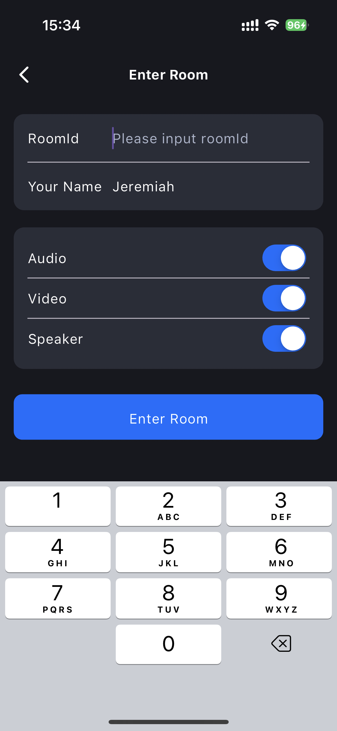 单击 Join Room 参与者可以通过填写对应的 RoomId,来加入由会议主持人创建的会议。