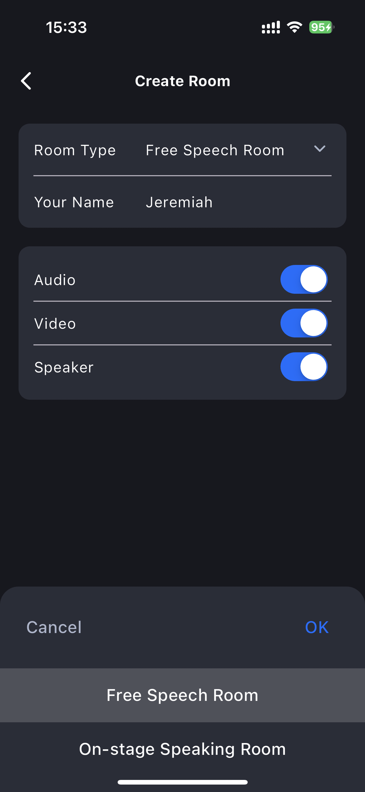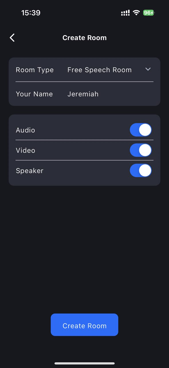 单击 Create Room 创建您的第一个会议房间,房间类型分别为自由发言房间举手发言房间