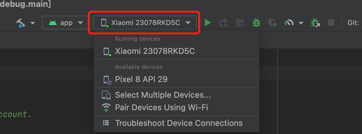 1. 在 Android Studio 右上角如下图所示处选择您要将 Demo 运行的设备: