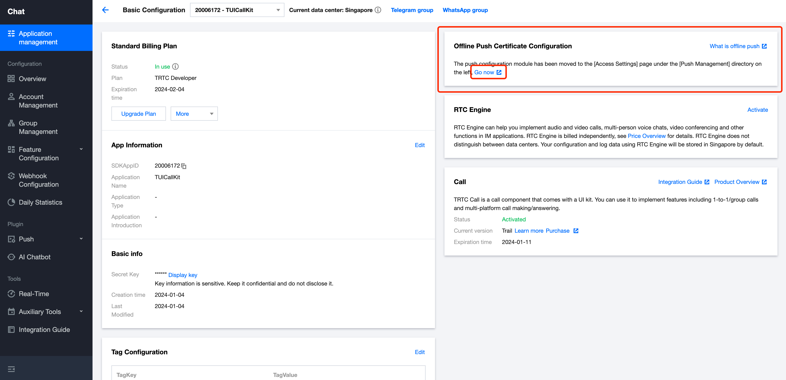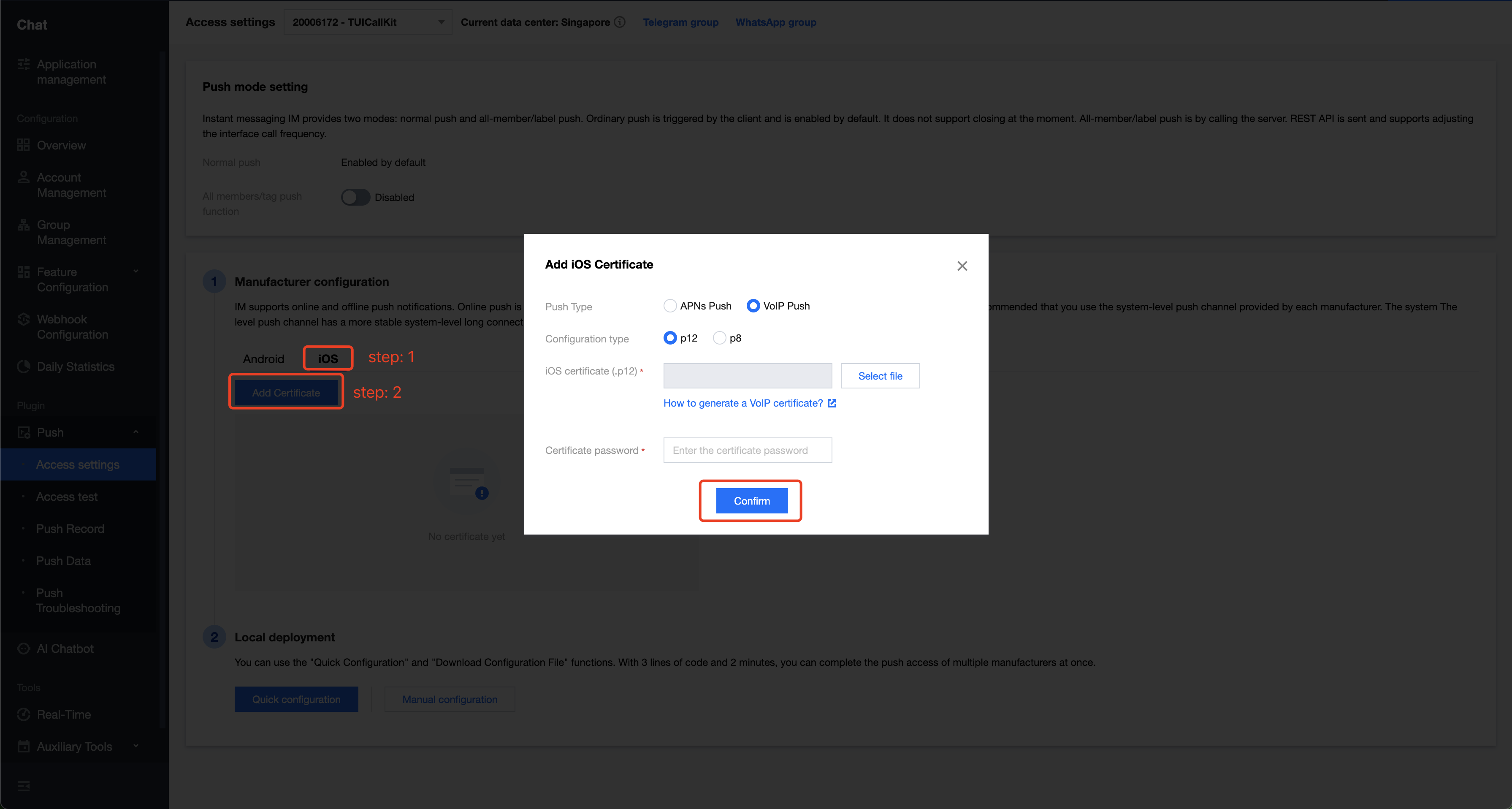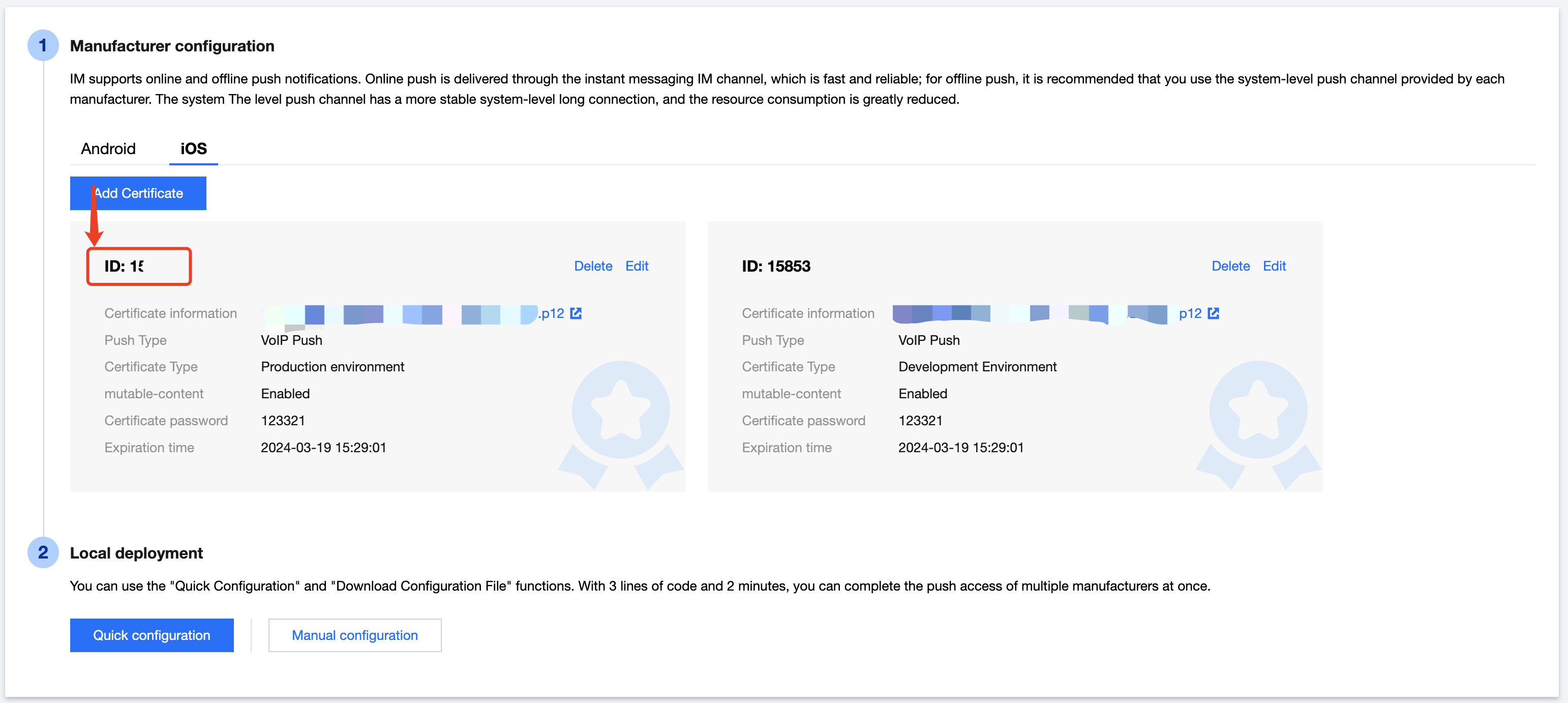 #import <TUIVoIPExtension/TUIVoIPExtension.h>- (BOOL)application:(UIApplication *)application didFinishLaunchingWithOptions:(NSDictionary *)launchOptions {// 上报证书 ID[TUIVoIPExtension setCertificateID:1234];return YES;}