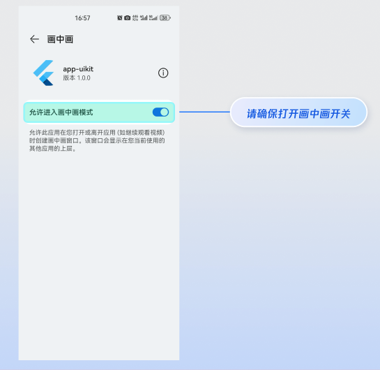 如果是 Android 平台,在您打开画中画开关后,还会自动检测 App 的系统画中画模式开关状态,如果没有打开,App 会自动跳转到设置页面,请您允许进入画中画模式: