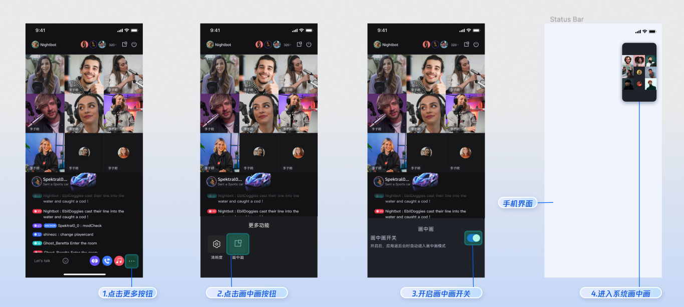 依次点击主播页面右下角的更多 > 画中画,打开画中画开关。然后,您的 App 退到后台时,将自动进入到系统画中画模式,效果如图所示: