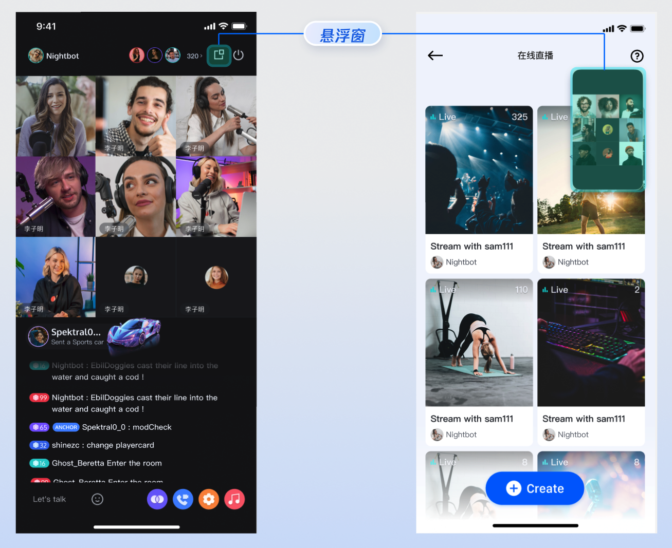 连麦嘉宾以浮动小窗形式显示。
