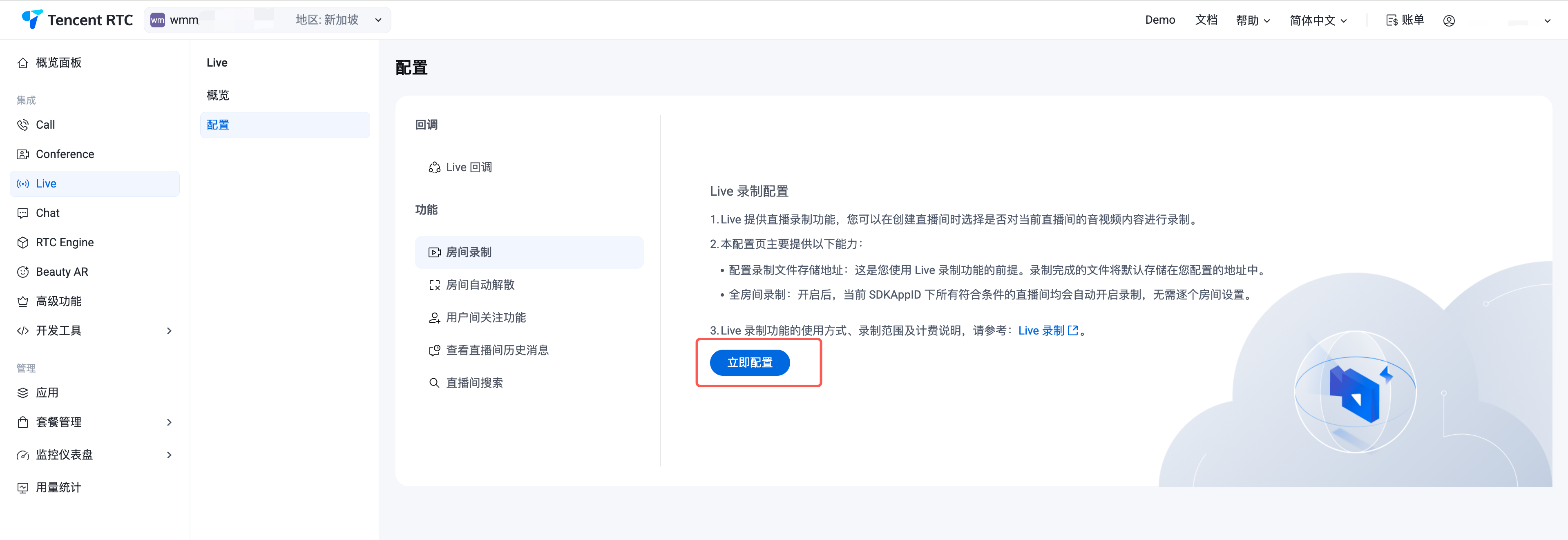 您在使用该功能前需要提前配置好您的录制存储地址,随后可以在创建 Live 直播间时决定当前房间是否需要录制,开启录制后,录制文件将默认存储在您配置好的存储地址中。具体细节请参考下述内容。