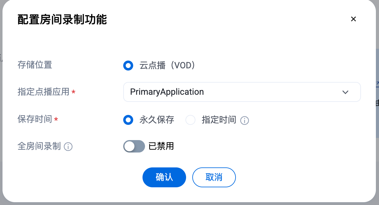 | 明确关闭录制 | 强制不录制。即使您在步骤一中开启了全房间录制,该房间也不会录制。 |