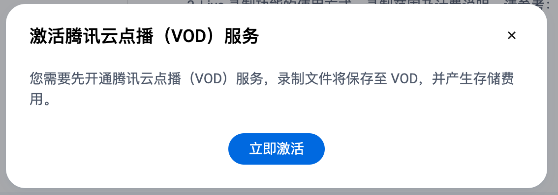 2. 若您尚未开通云点播(VOD)服务,点击立即配置后将跳转至 VOD 激活弹窗。若已开通 VOD 服务,请直接参考第 3 点。