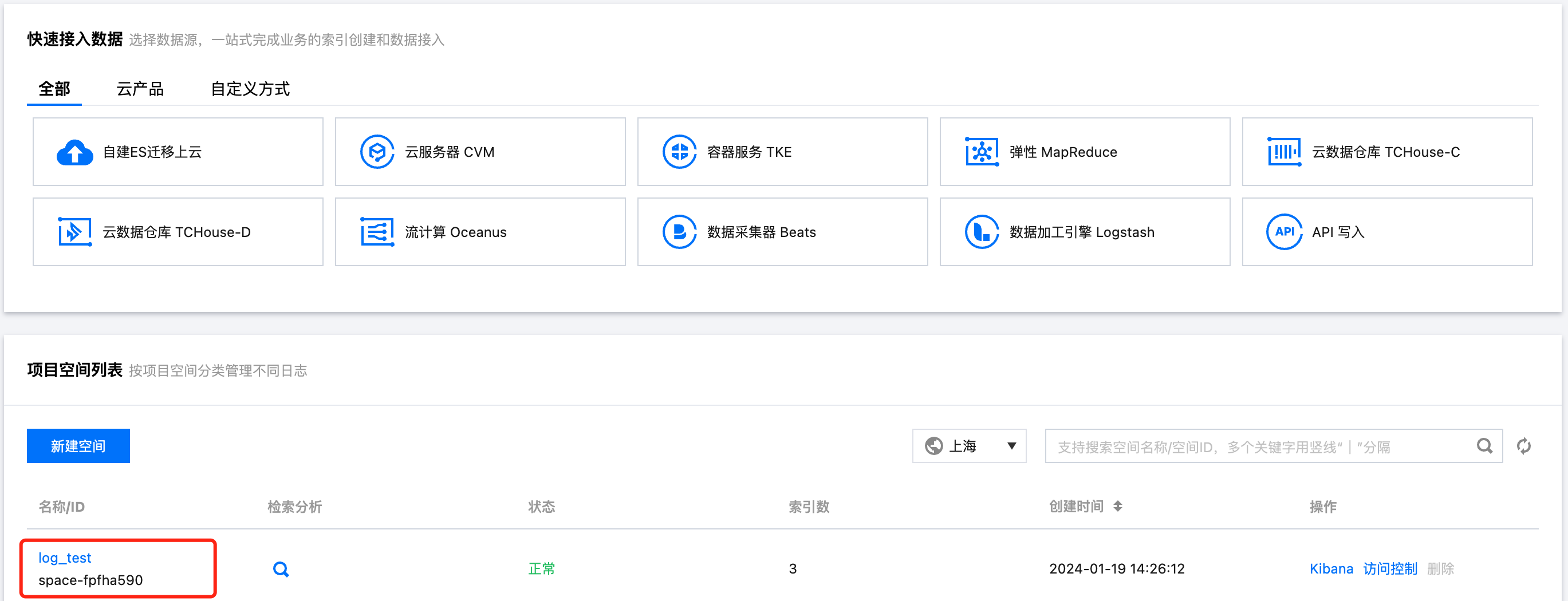 开启 Kibana 公网访问并设置好 Kibana 公网访问 IP 白名单后,单击 Kibana 公网访问地址,进入 Kibana 登录界面,输入该空间子用户的用户名与密码,单击 Log in 即可成功登录 Kibana。