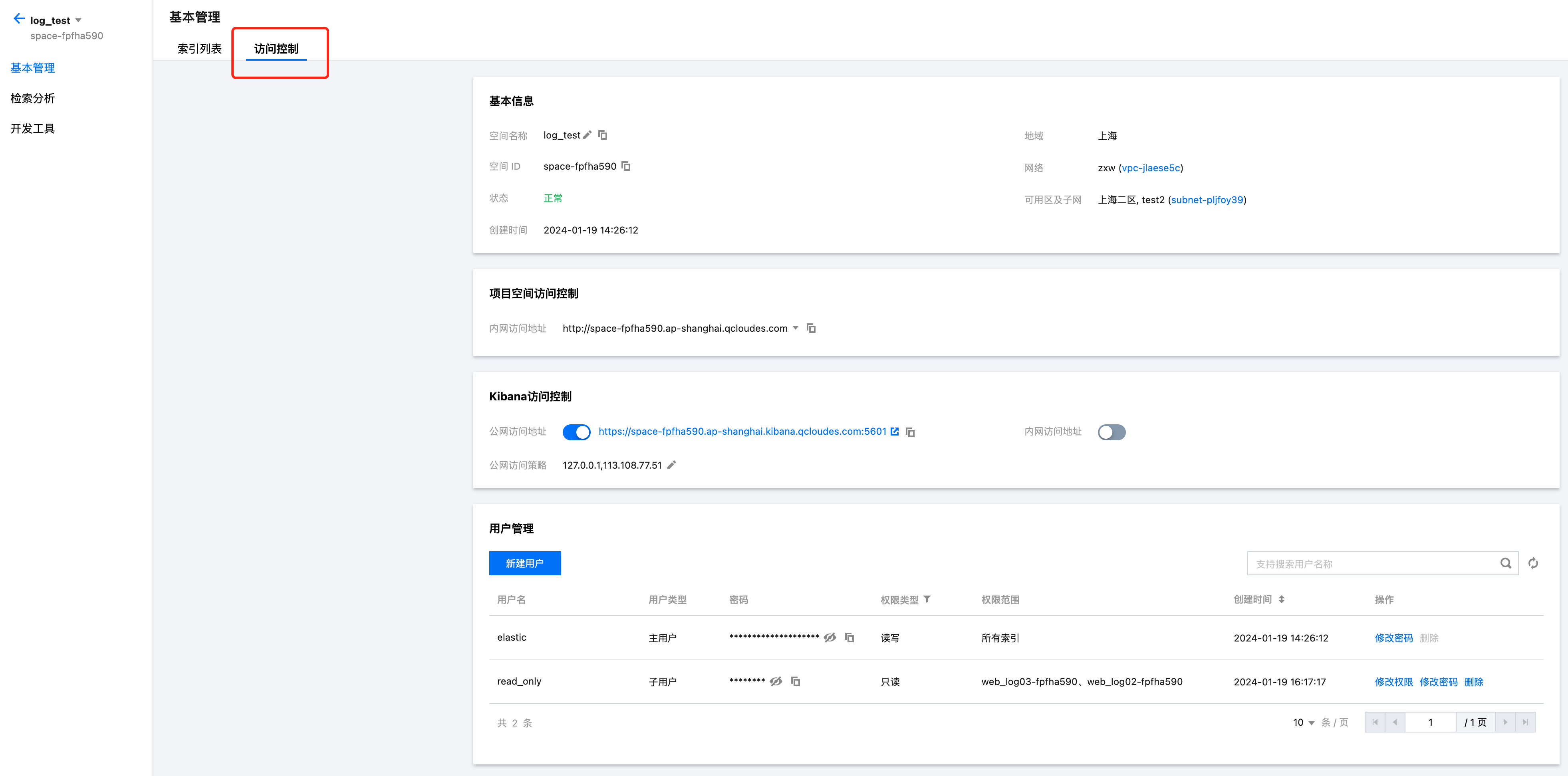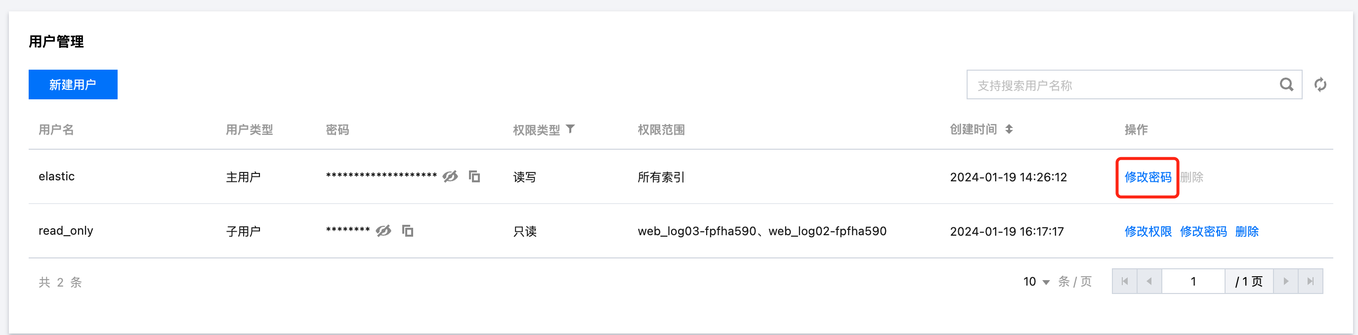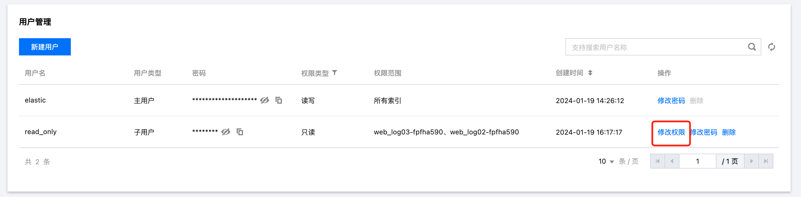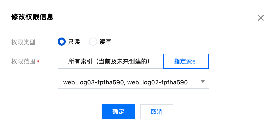 5. 修改子用户权限,在用户管理页面,单击修改权限,随后选择权限类型和权限范围,支持只读、读写两种权限类型,支持下拉选择该空间下的所有索引。