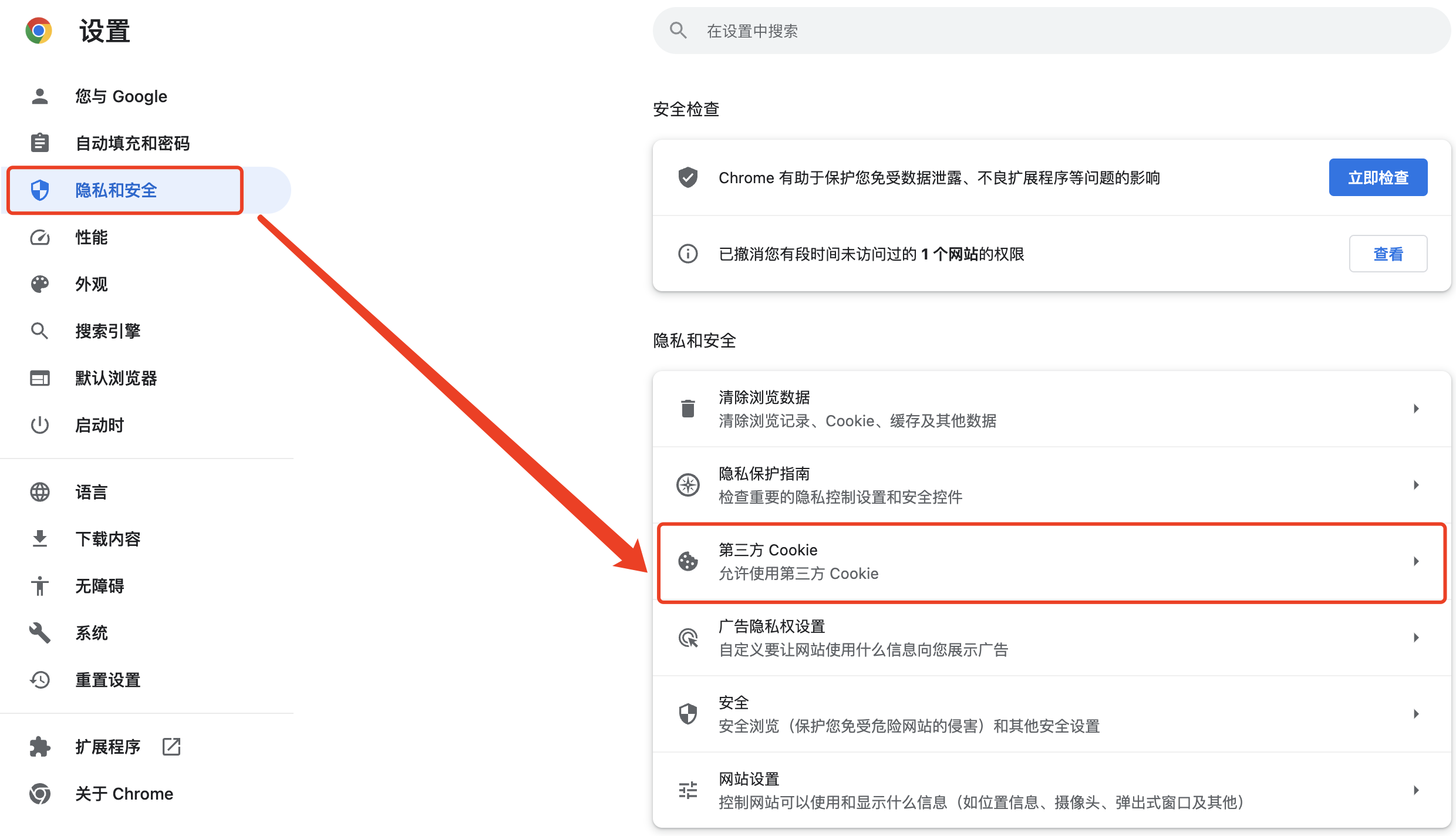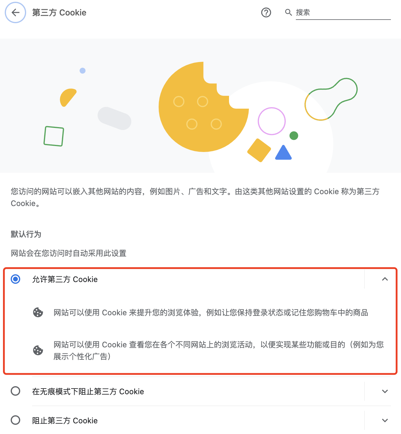 使用控制台检索分析能力需要浏览器支持第三方 Cookie,常见的浏览器设置方式参考如下: