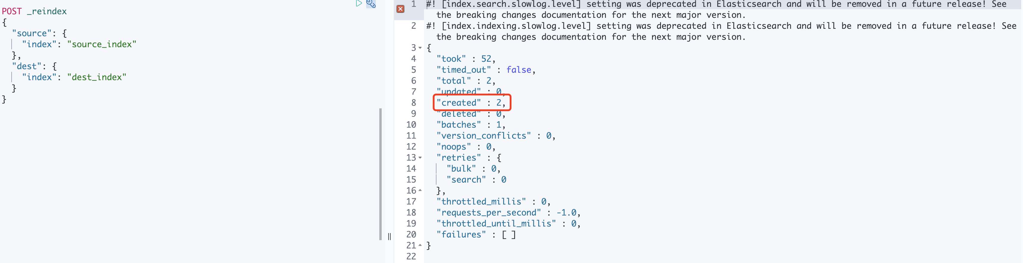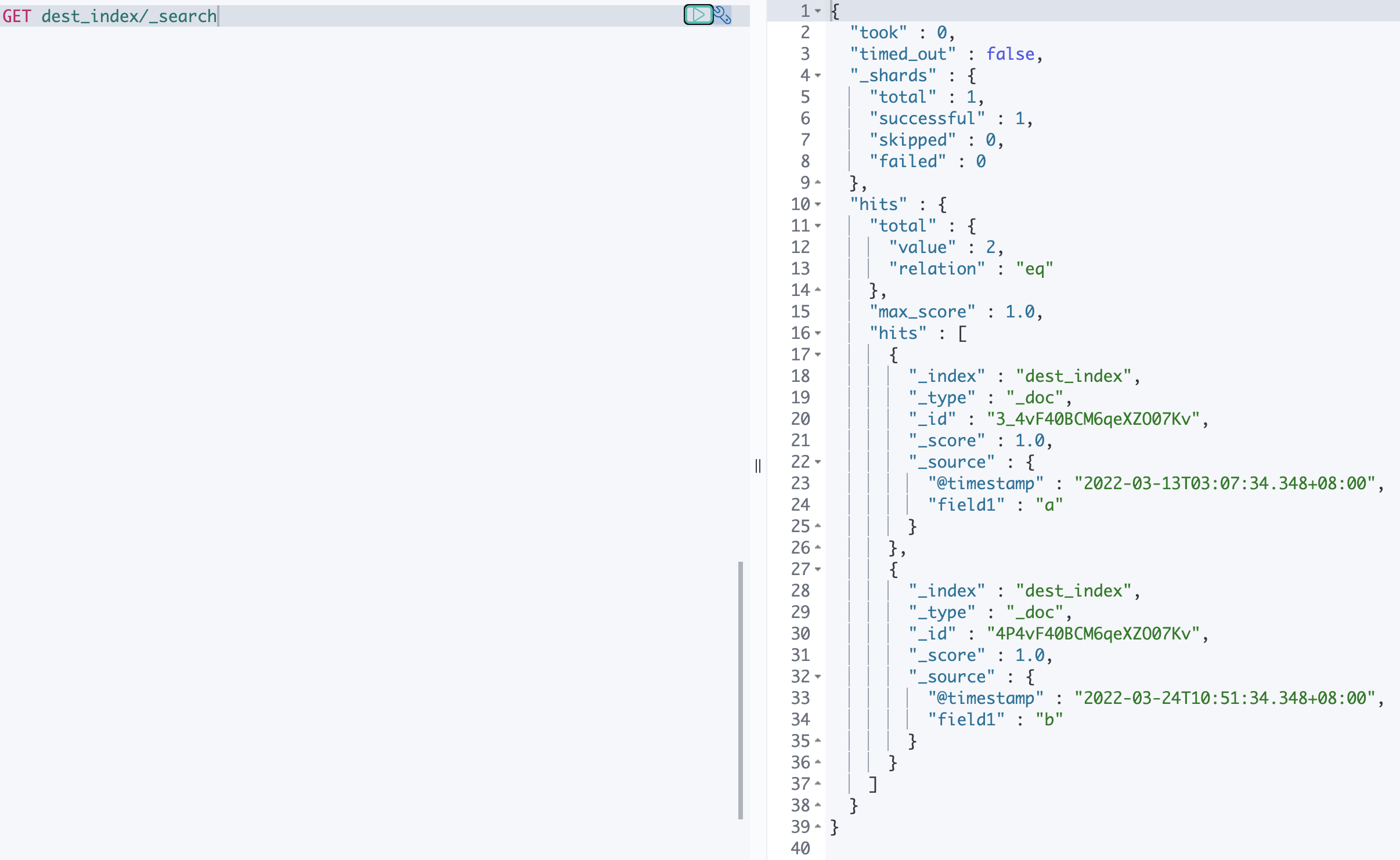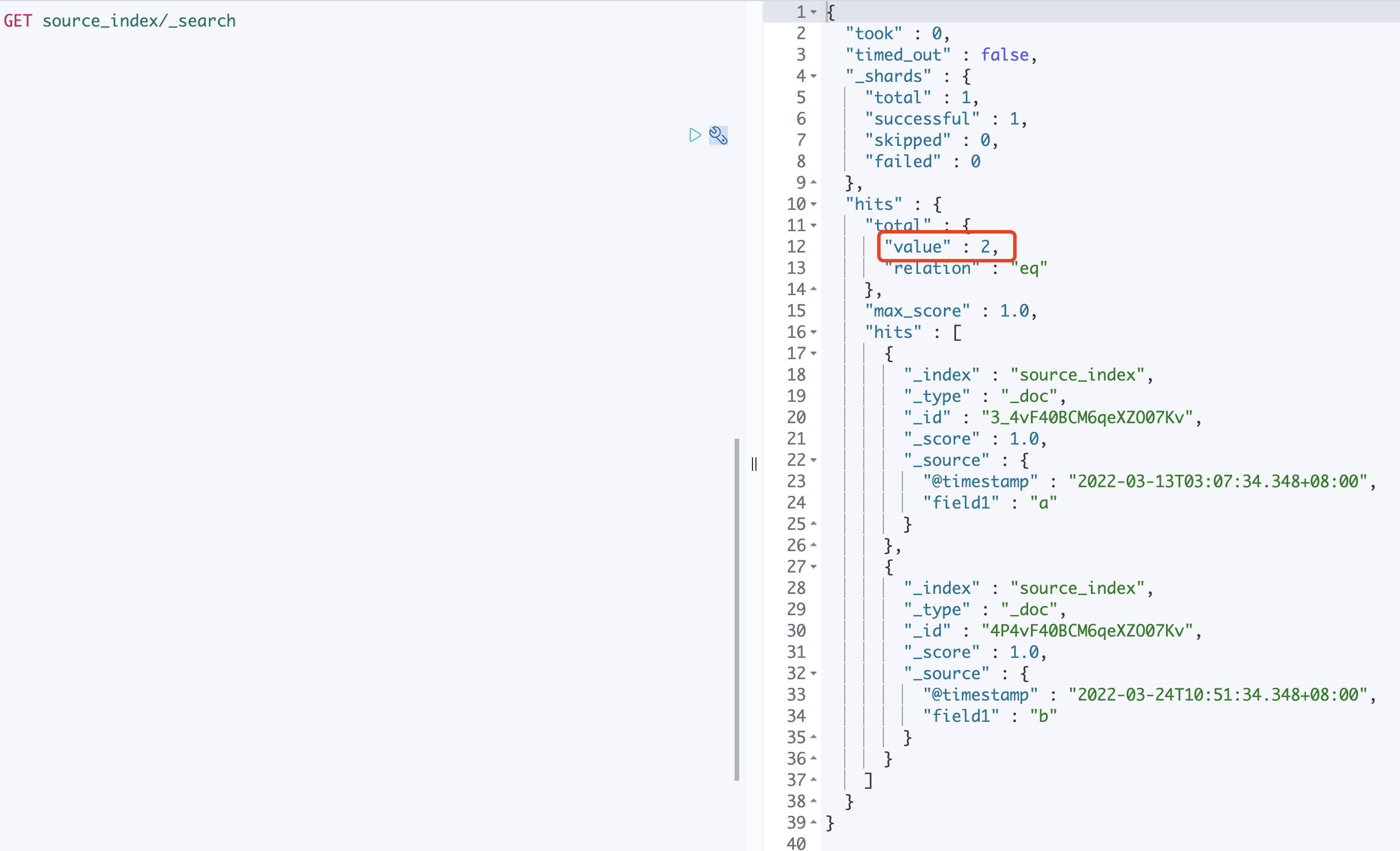 source_index中的数据同步到dest_index,对比原来source_index中的文档数,数量完全匹配。POST _reindex{"source": {"index": "source_index"},"dest": {"index": "dest_index"}}
