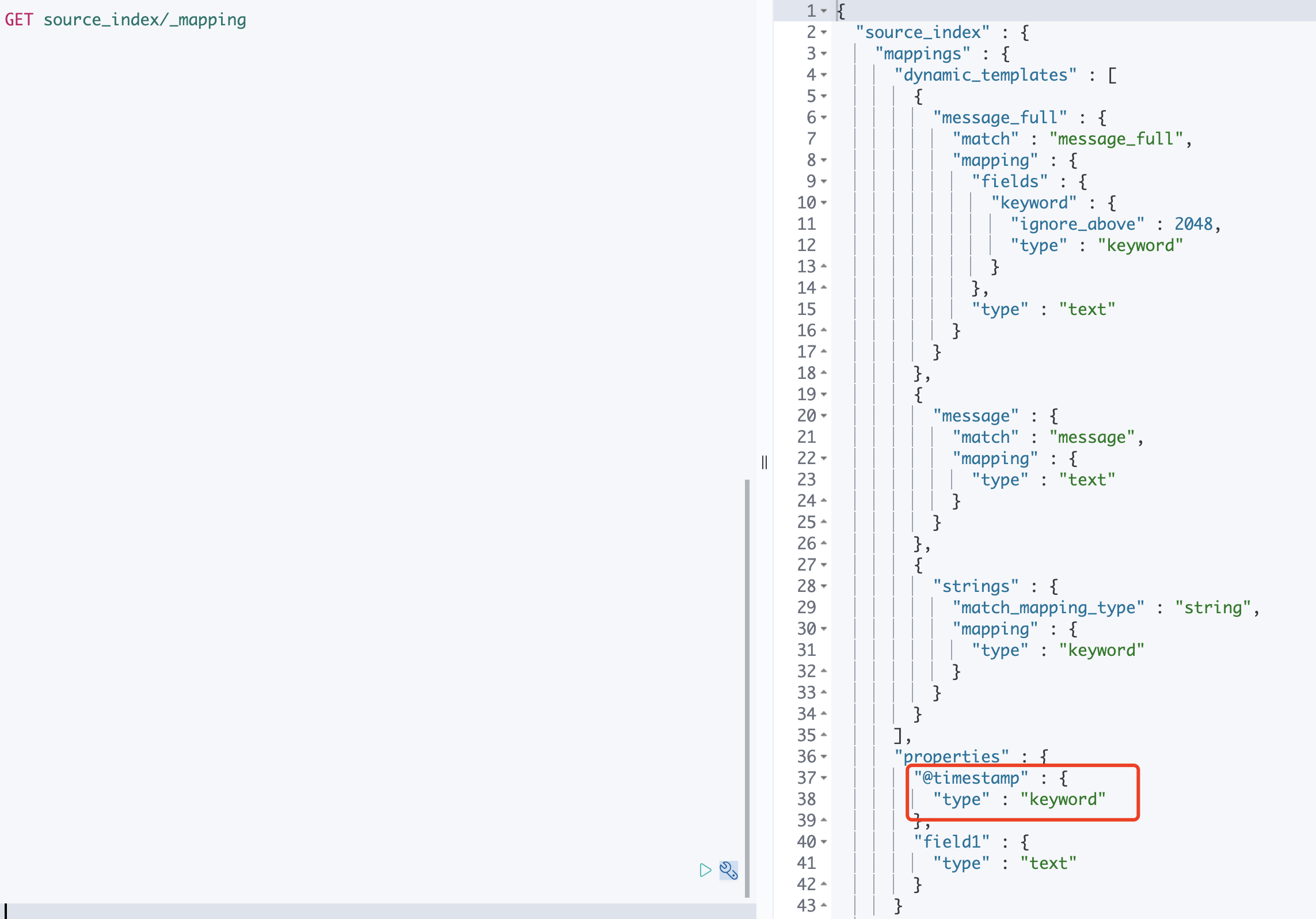 date。将已有 ES 集群数据同步到 ES Serverless 服务中的索引时,如果数据中的字段与时间字段名称一致而类型不一致时,将导致写入失败,此时我们可通过 reindex 的方式进行字段类型转换。date。source_index中的数据同步到 ES Serverless 服务中的索引(该索引时间字段为@timestamp),此时查看 source_index 的字段配置,发现source_index中字段@timestamp的字段类型为keyword类型,此时同步数据将出现写入报错。