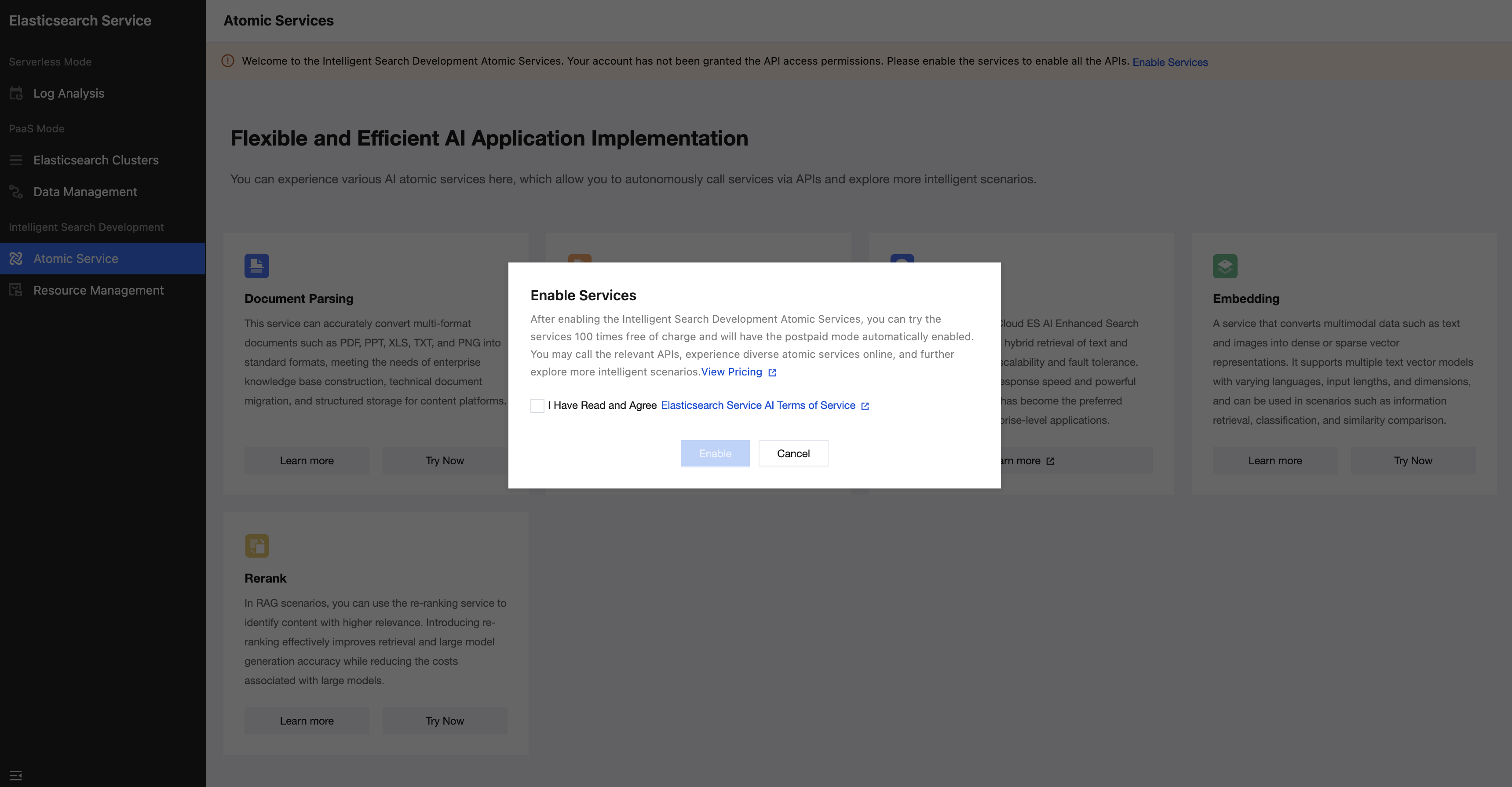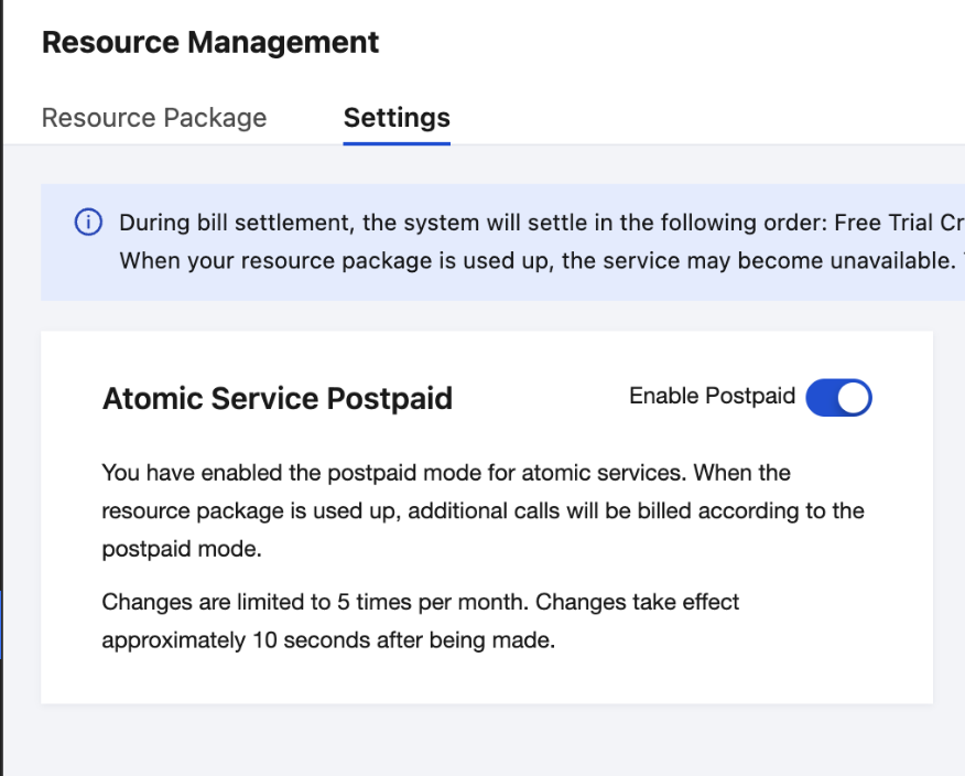 当开通智能搜索开发原子服务后,默认情况下会自动打开后付费,免费体验次数使用完后,若未购买预付费资源包,将会自动转入后付费。如需开启或关闭后付费模式结算,请前往控制台 > 资源管理 > 后付费设置 开通或关闭后付费。 说明: