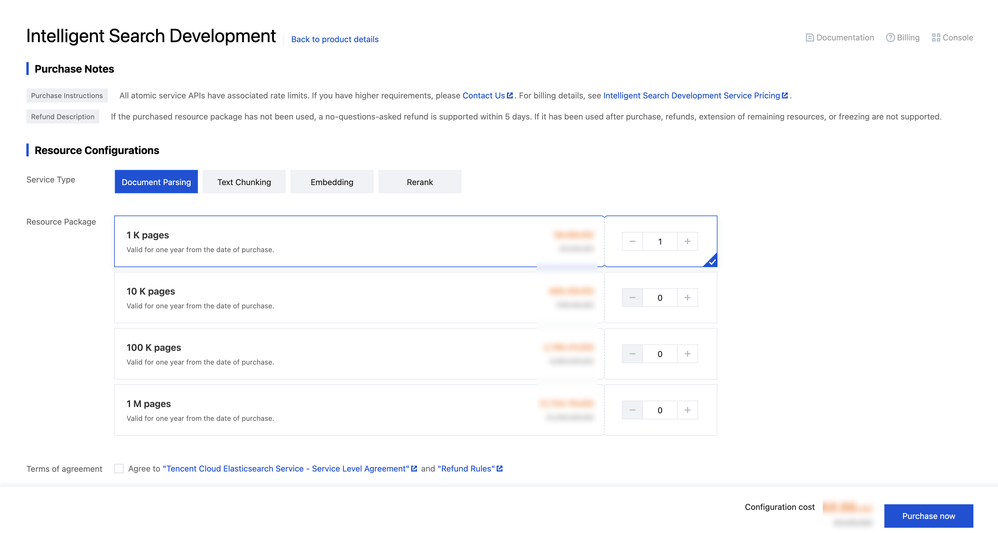 智能搜索开发服务提供预付费资源包的购买形式,用于各类原子服务消耗。相较于按量计费模式,资源包性价比更高,可前往购买页购买预付费资源包。 资源类型维度的定价